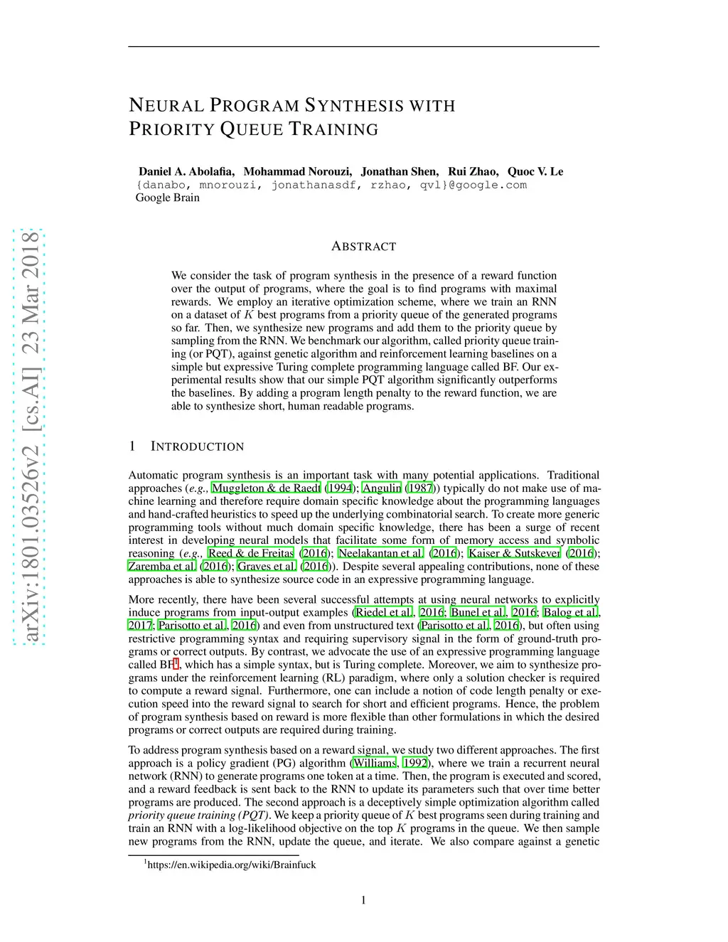 We consider the task of program synthesis in the presence of a reward function over the output of programs, where the goal is to find programs with maximal rewards. We employ an iterative optimization scheme, where we train an RNN on a dataset of K best programs from a priority queue of the generated programs so far. Then, we synthesize new programs and add them to the priority queue by sampling from the RNN. We benchmark our algorithm, called priority queue training (or PQT), against genetic algorithm and reinforcement learning baselines on a simple but expressive Turing complete programming language called BF. Our experimental results show that our simple PQT algorithm significantly outperforms the baselines. By adding a program length penalty to the reward function, we are able to synthesize short, human readable programs.