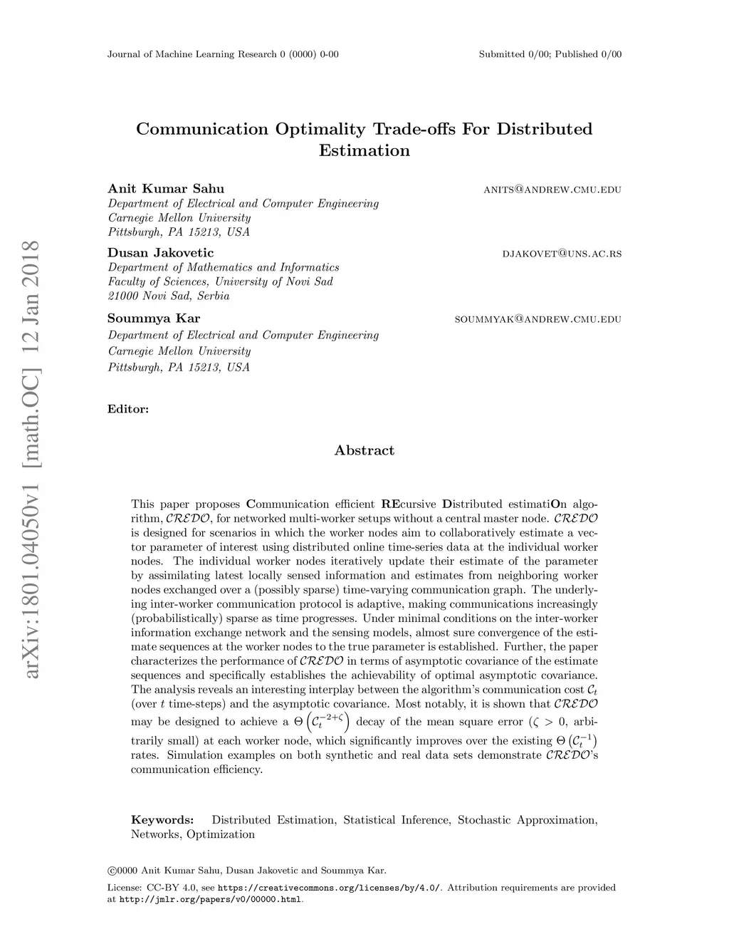 This paper proposes ommunication efficient cursive istributed estimatin algorithm, , for networked multi-worker setups without a central master node. is designed for scenarios in which the worker nodes aim to collaboratively estimate a vector parameter of interest using distributed online time-series data at the individual worker nodes. The individual worker nodes iteratively update their estimate of the parameter by assimilating latest locally sensed information and estimates from neighboring worker nodes exchanged over a (possibly sparse) time-varying communication graph. The underlying inter-worker communication protocol is adaptive, making communications increasingly (probabilistically) sparse as time progresses. Under minimal conditions on the inter-worker information exchange network and the sensing models, almost sure convergence of the estimate sequences at the worker nodes to the true parameter is established. Further, the paper characterizes the performance of in terms of asymptotic covariance of the estimate sequences and specifically establishes the achievability of optimal asymptotic covariance. The analysis reveals an interesting interplay between the algorithm's communication cost~ (over time-steps) and the asymptotic covariance. Most notably, it is shown that may be designed to achieve a decay of the mean square error~(, arbitrarily small) at each worker node, which significantly improves over the existing $ \Theta\left(\mathcal{C}_{t}^{-1}\right)$ rates. Simulation examples on both synthetic and real data sets demonstrate 's communication efficiency.