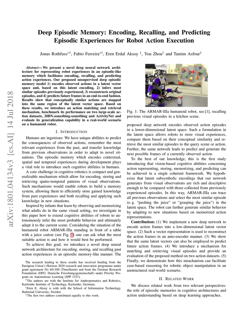 We present a novel deep neural network architecture for representing robot experiences in an episodic-like memory which facilitates encoding, recalling, and predicting action experiences. Our proposed unsupervised deep episodic memory model 1) encodes observed actions in a latent vector space and, based on this latent encoding, 2) infers most similar episodes previously experienced, 3) reconstructs original episodes, and 4) predicts future frames in an end-to-end fashion. Results show that conceptually similar actions are mapped into the same region of the latent vector space. Based on these results, we introduce an action matching and retrieval mechanism, benchmark its performance on two large-scale action datasets, 20BN-something-something and ActivityNet and evaluate its generalization capability in a real-world scenario on a humanoid robot.