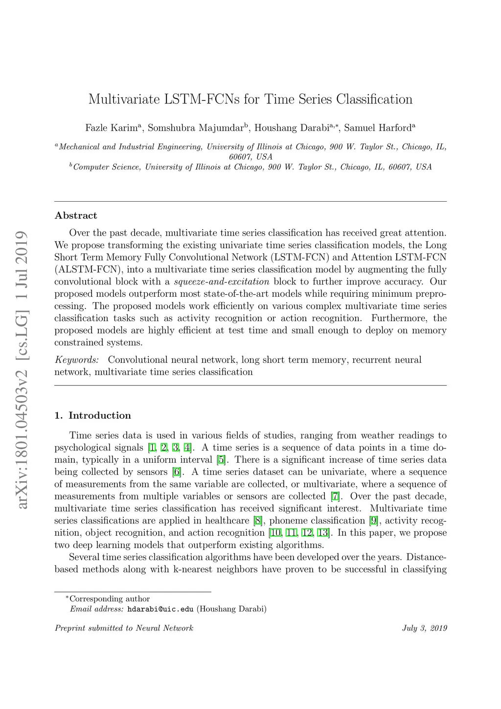 Over the past decade, multivariate time series classification has received great attention. We propose transforming the existing univariate time series classification models, the Long Short Term Memory Fully Convolutional Network (LSTM-FCN) and Attention LSTM-FCN (ALSTM-FCN), into a multivariate time series classification model by augmenting the fully convolutional block with a squeeze-and-excitation block to further improve accuracy. Our proposed models outperform most state-of-the-art models while requiring minimum preprocessing. The proposed models work efficiently on various complex multivariate time series classification tasks such as activity recognition or action recognition. Furthermore, the proposed models are highly efficient at test time and small enough to deploy on memory constrained systems.