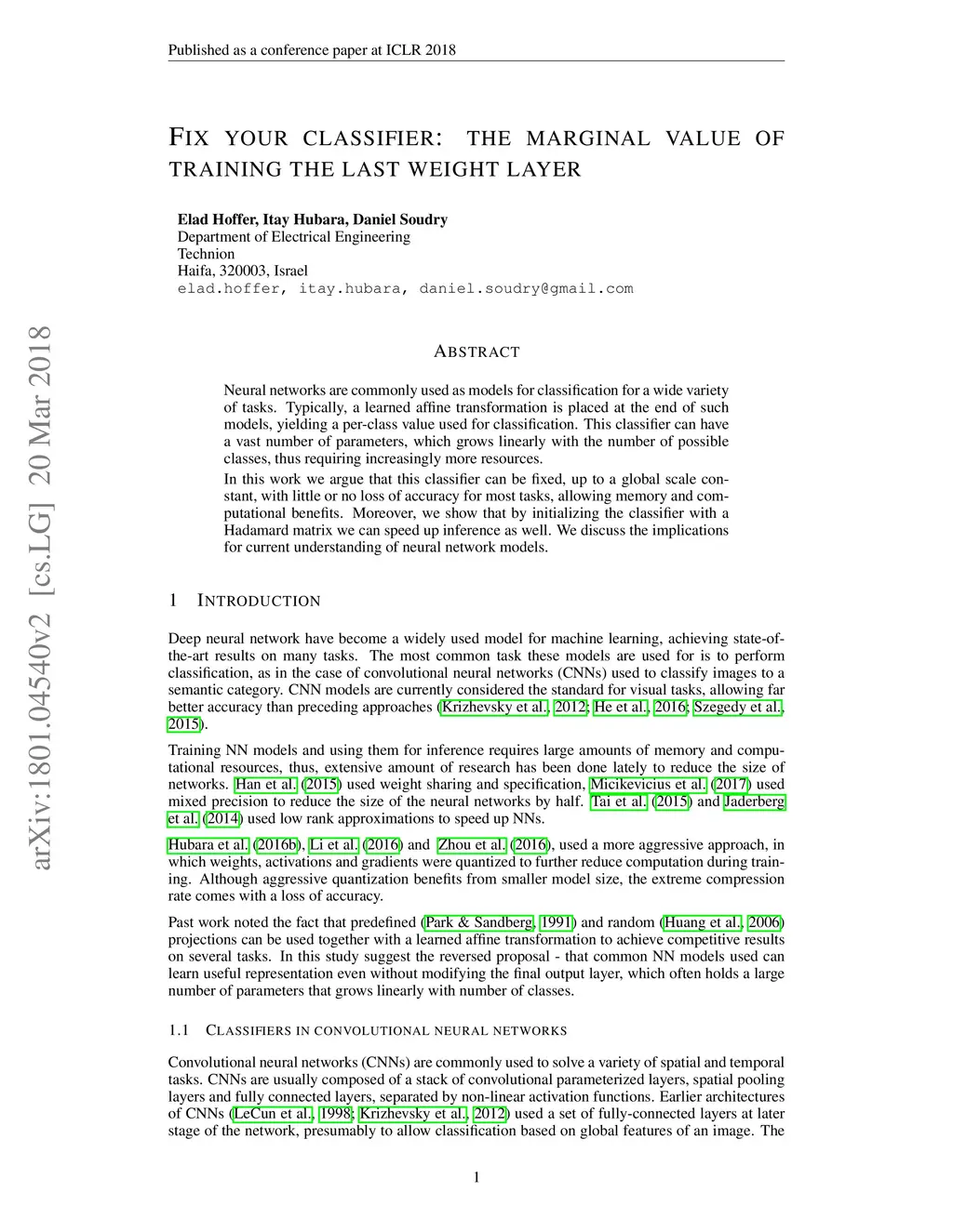 Neural networks are commonly used as models for classification for a wide variety of tasks. Typically, a learned affine transformation is placed at the end of such models, yielding a per-class value used for classification. This classifier can have a vast number of parameters, which grows linearly with the number of possible classes, thus requiring increasingly more resources. In this work we argue that this classifier can be fixed, up to a global scale constant, with little or no loss of accuracy for most tasks, allowing memory and computational benefits. Moreover, we show that by initializing the classifier with a Hadamard matrix we can speed up inference as well. We discuss the implications for current understanding of neural network models.