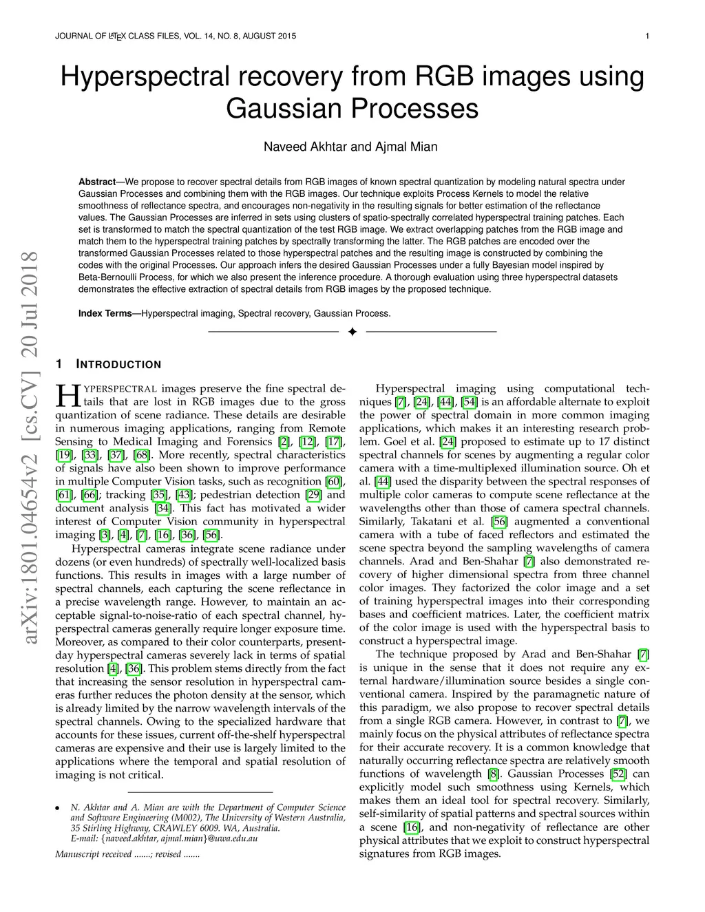 Hyperspectral recovery from RGB images using Gaussian Processes