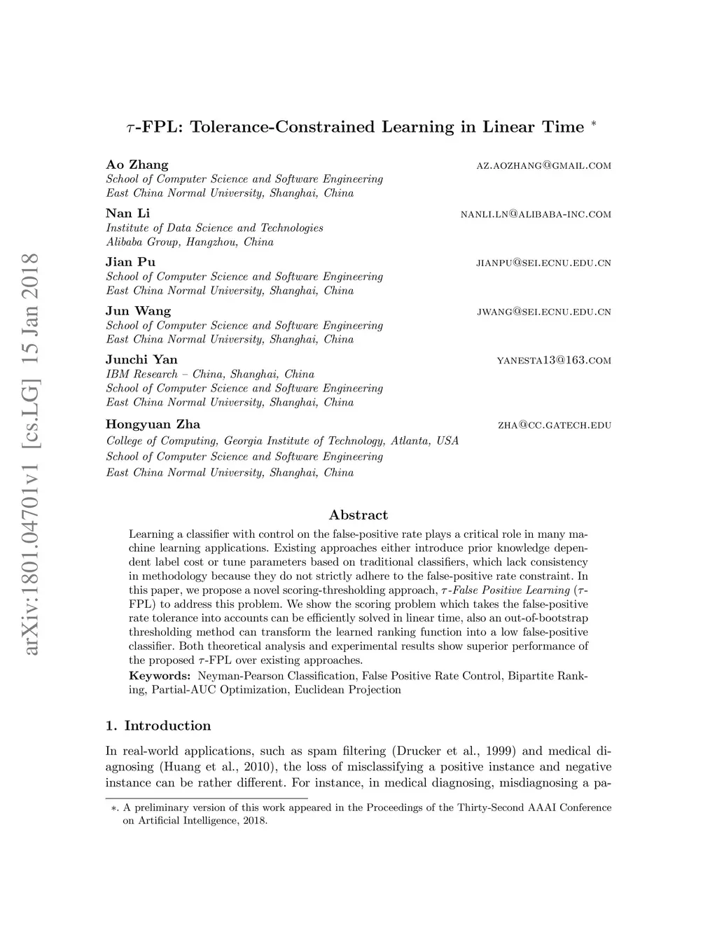 Learning a classifier with control on the false-positive rate plays a critical role in many machine learning applications. Existing approaches either introduce prior knowledge dependent label cost or tune parameters based on traditional classifiers, which lack consistency in methodology because they do not strictly adhere to the false-positive rate constraint. In this paper, we propose a novel scoring-thresholding approach, tau-False Positive Learning (tau-FPL) to address this problem. We show the scoring problem which takes the false-positive rate tolerance into accounts can be efficiently solved in linear time, also an out-of-bootstrap thresholding method can transform the learned ranking function into a low false-positive classifier. Both theoretical analysis and experimental results show superior performance of the proposed tau-FPL over existing approaches.