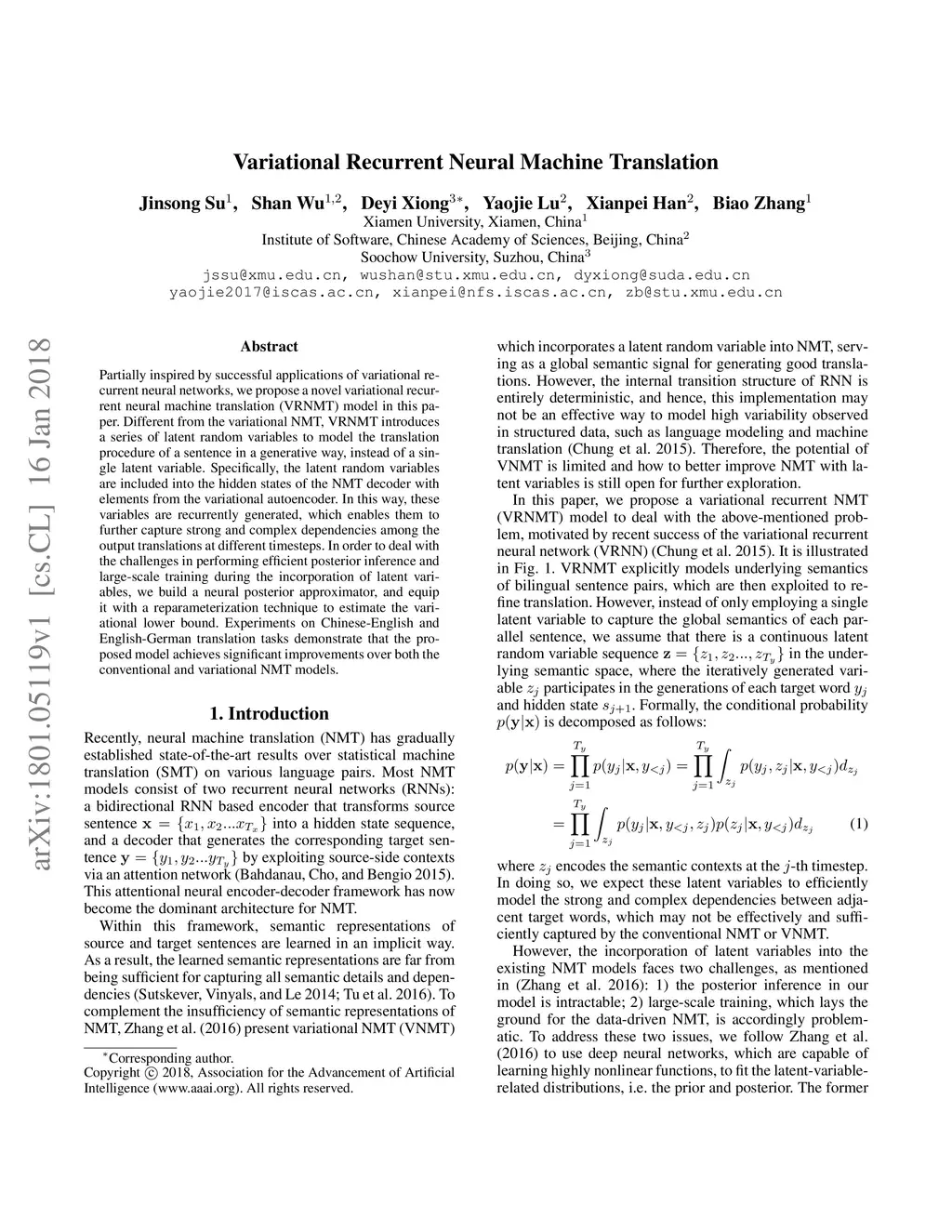Partially inspired by successful applications of variational recurrent neural networks, we propose a novel variational recurrent neural machine translation (VRNMT) model in this paper. Different from the variational NMT, VRNMT introduces a series of latent random variables to model the translation procedure of a sentence in a generative way, instead of a single latent variable. Specifically, the latent random variables are included into the hidden states of the NMT decoder with elements from the variational autoencoder. In this way, these variables are recurrently generated, which enables them to further capture strong and complex dependencies among the output translations at different timesteps. In order to deal with the challenges in performing efficient posterior inference and large-scale training during the incorporation of latent variables, we build a neural posterior approximator, and equip it with a reparameterization technique to estimate the variational lower bound. Experiments on Chinese-English and English-German translation tasks demonstrate that the proposed model achieves significant improvements over both the conventional and variational NMT models.