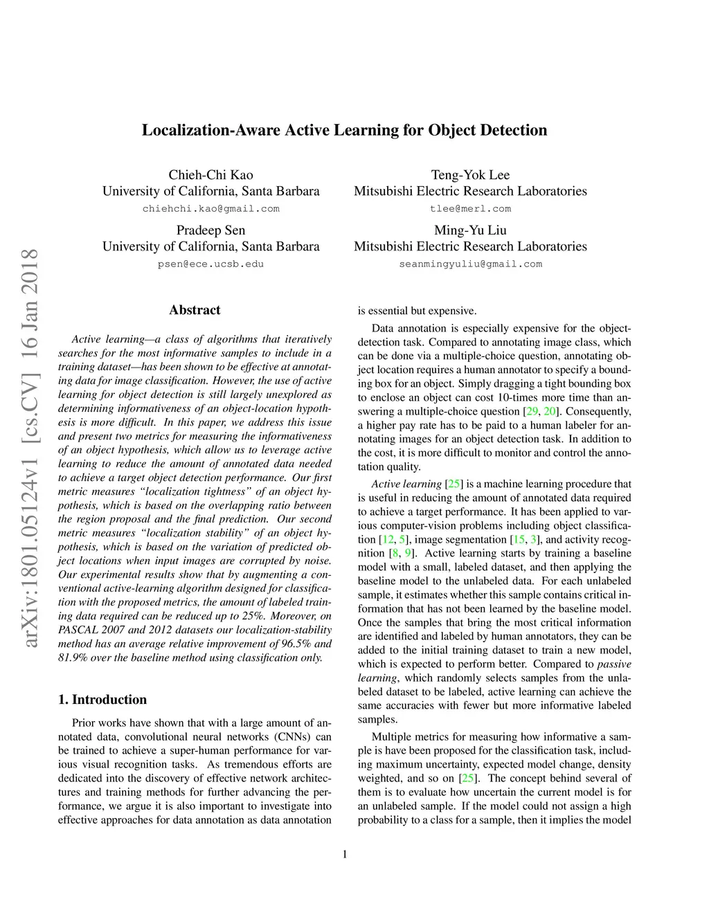 Active learning - a class of algorithms that iteratively searches for the most informative samples to include in a training dataset - has been shown to be effective at annotating data for image classification. However, the use of active learning for object detection is still largely unexplored as determining informativeness of an object-location hypothesis is more difficult. In this paper, we address this issue and present two metrics for measuring the informativeness of an object hypothesis, which allow us to leverage active learning to reduce the amount of annotated data needed to achieve a target object detection performance. Our first metric measures 'localization tightness' of an object hypothesis, which is based on the overlapping ratio between the region proposal and the final prediction. Our second metric measures 'localization stability' of an object hypothesis, which is based on the variation of predicted object locations when input images are corrupted by noise. Our experimental results show that by augmenting a conventional active-learning algorithm designed for classification with the proposed metrics, the amount of labeled training data required can be reduced up to 25%. Moreover, on PASCAL 2007 and 2012 datasets our localization-stability method has an average relative improvement of 96.5% and 81.9% over the baseline method using classification only.