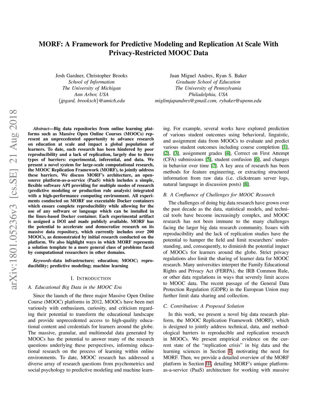Big data repositories from online learning platforms such as Massive Open Online Courses (MOOCs) represent an unprecedented opportunity to advance research on education at scale and impact a global population of learners. To date, such research has been hindered by poor reproducibility and a lack of replication, largely due to three types of barriers: experimental, inferential, and data. We present a novel system for large-scale computational research, the MOOC Replication Framework (MORF), to jointly address these barriers. We discuss MORF's architecture, an open-source platform-as-a-service (PaaS) which includes a simple, flexible software API providing for multiple modes of research (predictive modeling or production rule analysis) integrated with a high-performance computing environment. All experiments conducted on MORF use executable Docker containers which ensure complete reproducibility while allowing for the use of any software or language which can be installed in the linux-based Docker container. Each experimental artifact is assigned a DOI and made publicly available. MORF has the potential to accelerate and democratize research on its massive data repository, which currently includes over 200 MOOCs, as demonstrated by initial research conducted on the platform. We also highlight ways in which MORF represents a solution template to a more general class of problems faced by computational researchers in other domains.