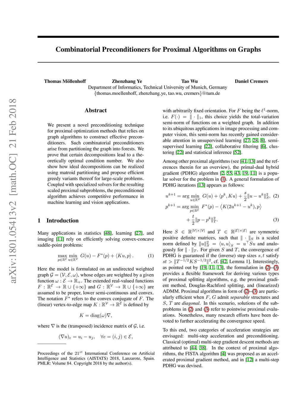 We present a novel preconditioning technique for proximal optimization methods that relies on graph algorithms to construct effective preconditioners. Such combinatorial preconditioners arise from partitioning the graph into forests. We prove that certain decompositions lead to a theoretically optimal condition number. We also show how ideal decompositions can be realized using matroid partitioning and propose efficient greedy variants thereof for large-scale problems. Coupled with specialized solvers for the resulting scaled proximal subproblems, the preconditioned algorithm achieves competitive performance in machine learning and vision applications.