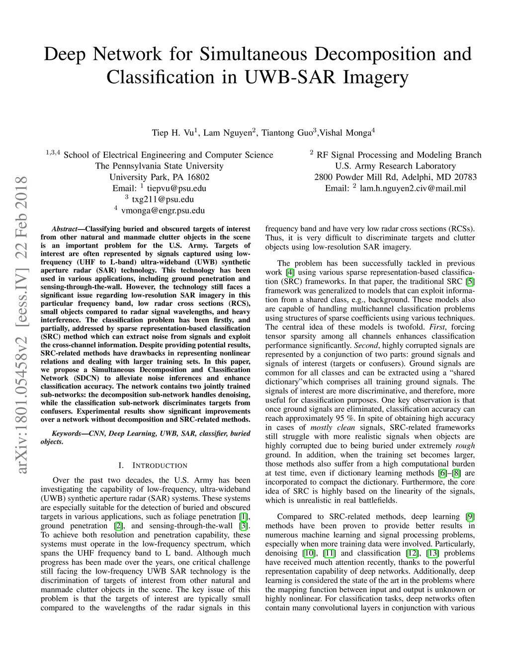 Classifying buried and obscured targets of interest from other natural and manmade clutter objects in the scene is an important problem for the U.S. Army. Targets of interest are often represented by signals captured using low-frequency (UHF to L-band) ultra-wideband (UWB) synthetic aperture radar (SAR) technology. This technology has been used in various applications, including ground penetration and sensing-through-the-wall. However, the technology still faces a significant issues regarding low-resolution SAR imagery in this particular frequency band, low radar cross sections (RCS), small objects compared to radar signal wavelengths, and heavy interference. The classification problem has been firstly, and partially, addressed by sparse representation-based classification (SRC) method which can extract noise from signals and exploit the cross-channel information. Despite providing potential results, SRC-related methods have drawbacks in representing nonlinear relations and dealing with larger training sets. In this paper, we propose a Simultaneous Decomposition and Classification Network (SDCN) to alleviate noise inferences and enhance classification accuracy. The network contains two jointly trained sub-networks: the decomposition sub-network handles denoising, while the classification sub-network discriminates targets from confusers. Experimental results show significant improvements over a network without decomposition and SRC-related methods.