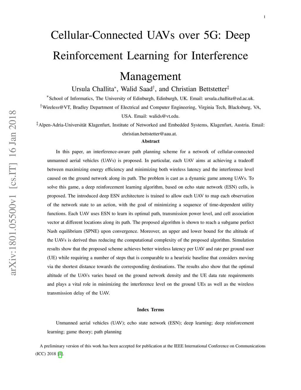 In this paper, an interference-aware path planning scheme for a network of cellular-connected unmanned aerial vehicles (UAVs) is proposed. In particular, each UAV aims at achieving a tradeoff between maximizing energy efficiency and minimizing both wireless latency and the interference level caused on the ground network along its path. The problem is cast as a dynamic game among UAVs. To solve this game, a deep reinforcement learning algorithm, based on echo state network (ESN) cells, is proposed. The introduced deep ESN architecture is trained to allow each UAV to map each observation of the network state to an action, with the goal of minimizing a sequence of time-dependent utility functions. Each UAV uses ESN to learn its optimal path, transmission power level, and cell association vector at different locations along its path. The proposed algorithm is shown to reach a subgame perfect Nash equilibrium (SPNE) upon convergence. Moreover, an upper and lower bound for the altitude of the UAVs is derived thus reducing the computational complexity of the proposed algorithm. Simulation results show that the proposed scheme achieves better wireless latency per UAV and rate per ground user (UE) while requiring a number of steps that is comparable to a heuristic baseline that considers moving via the shortest distance towards the corresponding destinations. The results also show that the optimal altitude of the UAVs varies based on the ground network density and the UE data rate requirements and plays a vital role in minimizing the interference level on the ground UEs as well as the wireless transmission delay of the UAV.