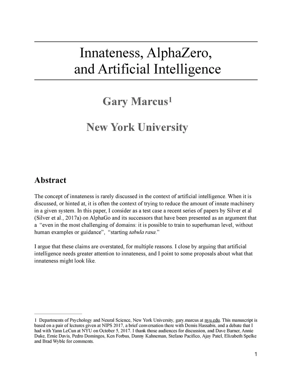 The concept of innateness is rarely discussed in the context of artificial intelligence. When it is discussed, or hinted at, it is often the context of trying to reduce the amount of innate machinery in a given system. In this paper, I consider as a test case a recent series of papers by Silver et al (Silver et al., 2017a) on AlphaGo and its successors that have been presented as an argument that a "even in the most challenging of domains: it is possible to train to superhuman level, without human examples or guidance", "starting tabula rasa." I argue that these claims are overstated, for multiple reasons. I close by arguing that artificial intelligence needs greater attention to innateness, and I point to some proposals about what that innateness might look like.
