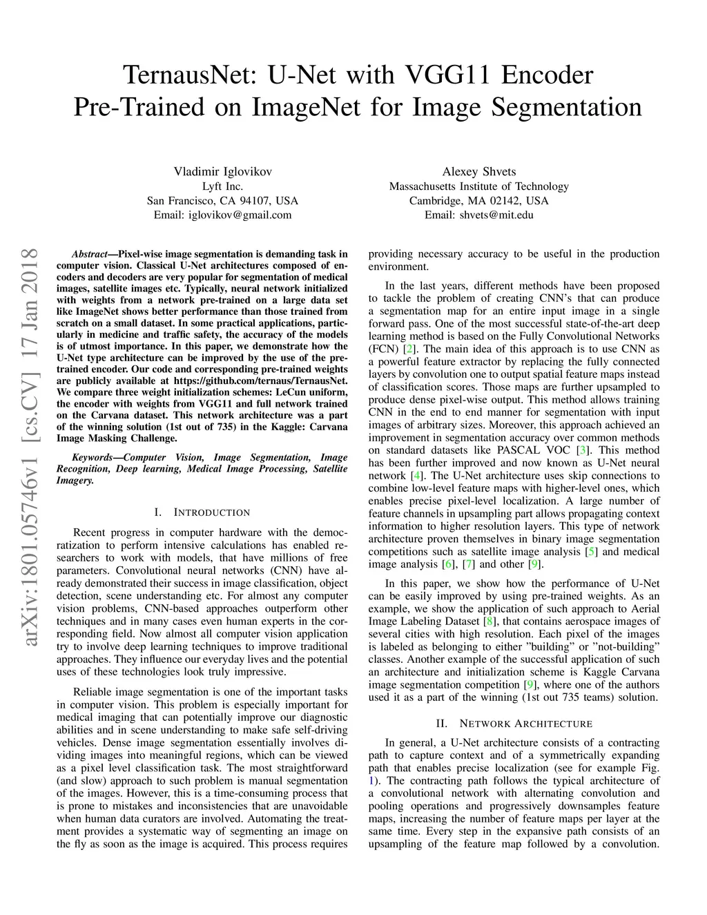 TernausNet: U-Net with VGG11 Encoder Pre-Trained on ImageNet for Image