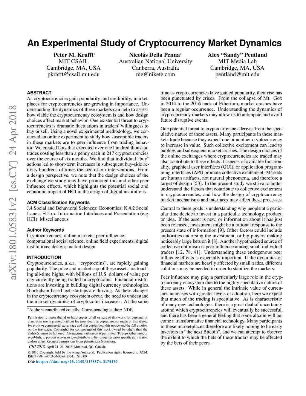 As cryptocurrencies gain popularity and credibility, marketplaces for cryptocurrencies are growing in importance. Understanding the dynamics of these markets can help to assess how viable the cryptocurrnency ecosystem is and how design choices affect market behavior. One existential threat to cryptocurrencies is dramatic fluctuations in traders' willingness to buy or sell. Using a novel experimental methodology, we conducted an online experiment to study how susceptible traders in these markets are to peer influence from trading behavior. We created bots that executed over one hundred thousand trades costing less than a penny each in 217 cryptocurrencies over the course of six months. We find that individual "buy" actions led to short-term increases in subsequent buy-side activity hundreds of times the size of our interventions. From a design perspective, we note that the design choices of the exchange we study may have promoted this and other peer influence effects, which highlights the potential social and economic impact of HCI in the design of digital institutions.