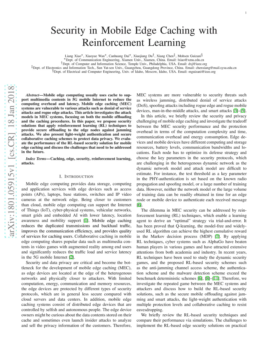 Mobile edge computing usually uses cache to support multimedia contents in 5G mobile Internet to reduce the computing overhead and latency. Mobile edge caching (MEC) systems are vulnerable to various attacks such as denial of service attacks and rogue edge attacks. This article investigates the attack models in MEC systems, focusing on both the mobile offloading and the caching procedures. In this paper, we propose security solutions that apply reinforcement learning (RL) techniques to provide secure offloading to the edge nodes against jamming attacks. We also present light-weight authentication and secure collaborative caching schemes to protect data privacy. We evaluate the performance of the RL-based security solution for mobile edge caching and discuss the challenges that need to be addressed in the future.