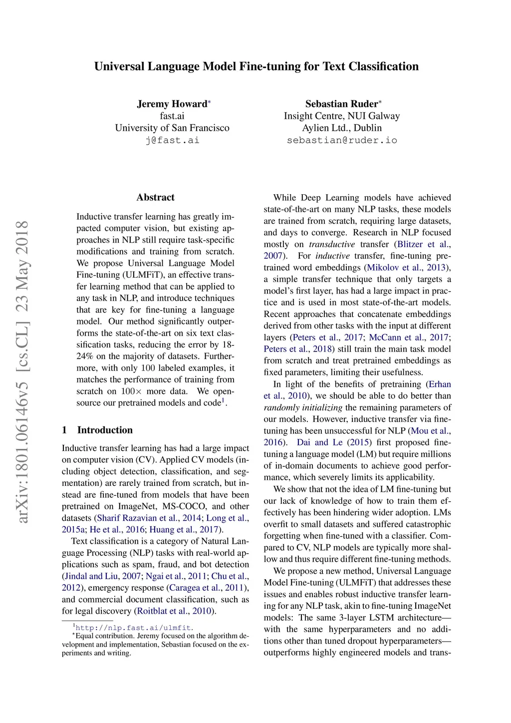 Inductive transfer learning has greatly impacted computer vision, but existing approaches in NLP still require task-specific modifications and training from scratch. We propose Universal Language Model Fine-tuning (ULMFiT), an effective transfer learning method that can be applied to any task in NLP, and introduce techniques that are key for fine-tuning a language model. Our method significantly outperforms the state-of-the-art on six text classification tasks, reducing the error by 18-24% on the majority of datasets. Furthermore, with only 100 labeled examples, it matches the performance of training from scratch on 100x more data. We open-source our pretrained models and code.