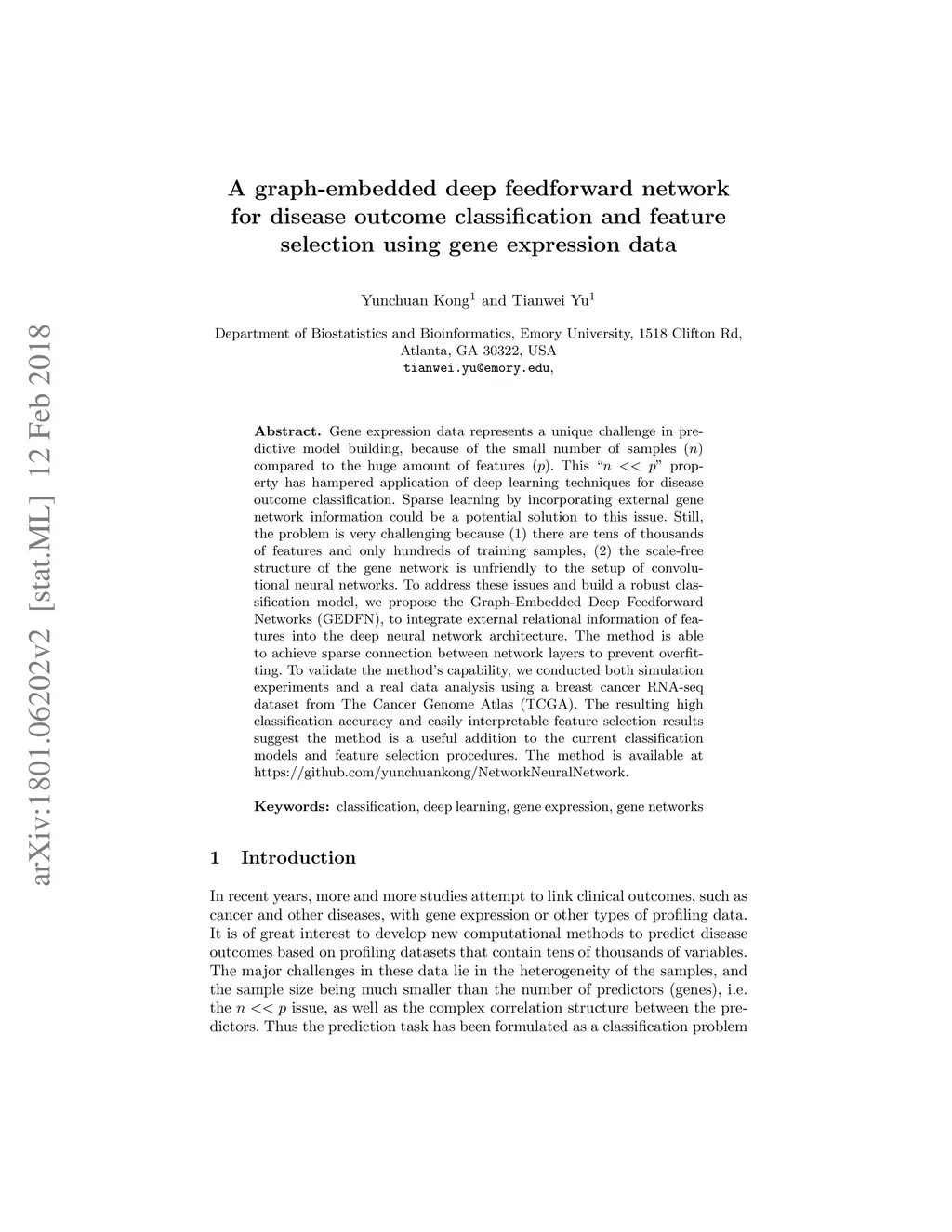 A graph-embedded deep feedforward network for disease outcome classification and feature selection using gene expression data