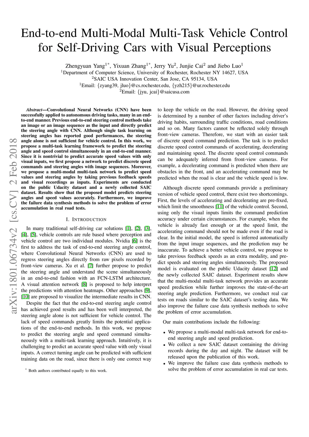 Convolutional Neural Networks (CNN) have been successfully applied to autonomous driving tasks, many in an end-to-end manner. Previous end-to-end steering control methods take an image or an image sequence as the input and directly predict the steering angle with CNN. Although single task learning on steering angles has reported good performances, the steering angle alone is not sufficient for vehicle control. In this work, we propose a multi-task learning framework to predict the steering angle and speed control simultaneously in an end-to-end manner. Since it is nontrivial to predict accurate speed values with only visual inputs, we first propose a network to predict discrete speed commands and steering angles with image sequences. Moreover, we propose a multi-modal multi-task network to predict speed values and steering angles by taking previous feedback speeds and visual recordings as inputs. Experiments are conducted on the public Udacity dataset and a newly collected SAIC dataset. Results show that the proposed model predicts steering angles and speed values accurately. Furthermore, we improve the failure data synthesis methods to solve the problem of error accumulation in real road tests.