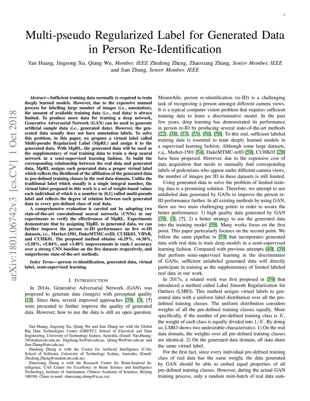 Sufficient training data normally is required to train deeply learned models. However, due to the expensive manual process for labelling large number of images, the amount of available training data is always limited. To produce more data for training a deep network, Generative Adversarial Network (GAN) can be used to generate artificial sample data. However, the generated data usually does not have annotation labels. To solve this problem, in this paper, we propose a virtual label called Multi-pseudo Regularized Label (MpRL) and assign it to the generated data. With MpRL, the generated data will be used as the supplementary of real training data to train a deep neural network in a semi-supervised learning fashion. To build the corresponding relationship between the real data and generated data, MpRL assigns each generated data a proper virtual label which reflects the likelihood of the affiliation of the generated data to pre-defined training classes in the real data domain. Unlike the traditional label which usually is a single integral number, the virtual label proposed in this work is a set of weight-based values each individual of which is a number in (0,1] called multi-pseudo label and reflects the degree of relation between each generated data to every pre-defined class of real data. A comprehensive evaluation is carried out by adopting two state-of-the-art convolutional neural networks (CNNs) in our experiments to verify the effectiveness of MpRL. Experiments demonstrate that by assigning MpRL to generated data, we can further improve the person re-ID performance on five re-ID datasets, i.e., Market-1501, DukeMTMC-reID, CUHK03, VIPeR, and CUHK01. The proposed method obtains +6.29%, +6.30%, +5.58%, +5.84%, and +3.48% improvements in rank-1 accuracy over a strong CNN baseline on the five datasets respectively, and outperforms state-of-the-art methods.