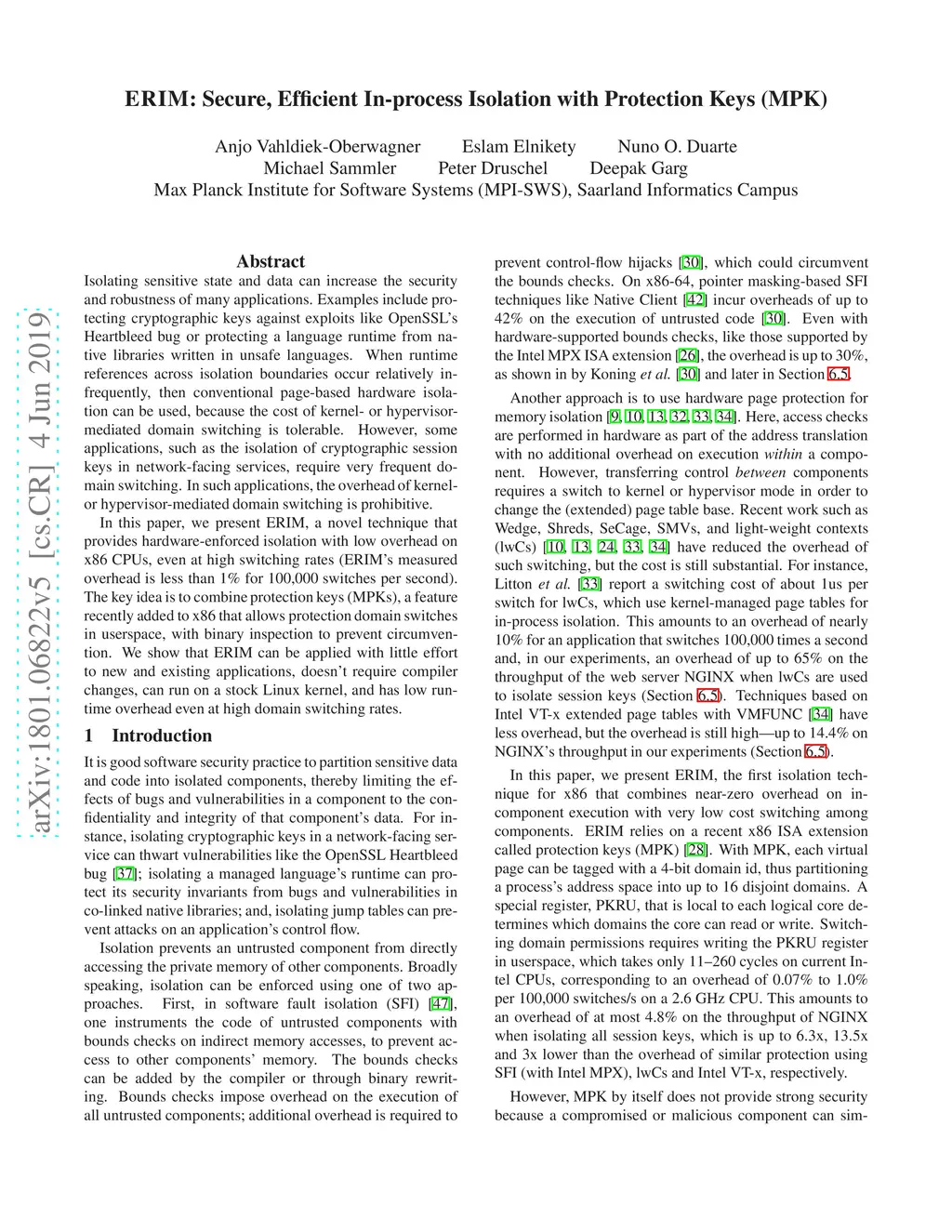 ERIM: Secure, Efficient In-process Isolation with Memory Protection Keys