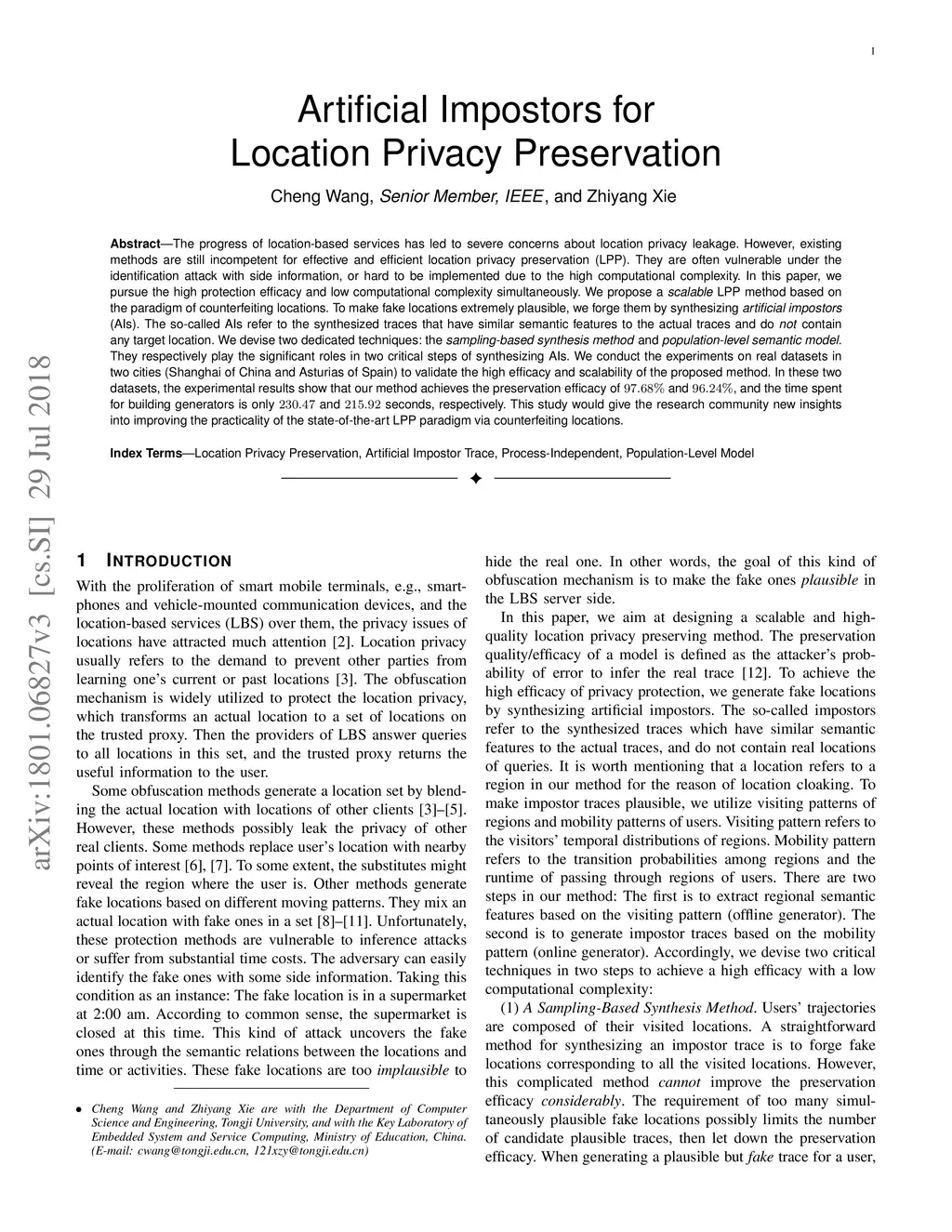 The progress of location-based services has led to serious concerns on location privacy leakage. For effective and efficient location privacy preservation (LPP), existing methods are still not fully competent. They are often vulnerable under the identification attack with side information, or hard to be implemented due to the high computational complexity. In this paper, we pursue the high protection efficacy and low computational complexity simultaneously. We propose a scalable LPP method based on the paradigm of counterfeiting locations. To make fake locations extremely plausible, we forge them through synthesizing artificial impostors (AIs). The AIs refer to the synthesized traces which have similar semantic features to the actual traces, and do not contain any target location. Two dedicated techniques are devised: the sampling-based synthesis method and population-level semantic model. They play significant roles in two critical steps of synthesizing AIs. We conduct experiments on real datasets in two cities (Shanghai, China and Asturias, Spain) to validate the high efficacy and scalability of the proposed method. In these two datasets, the experimental results show that our method achieves the preservation efficacy of and , and its run time of building the generators is only and seconds, respectively. This study would give the research community new insights into improving the practicality of the state-of-the-art LPP paradigm via counterfeiting locations.