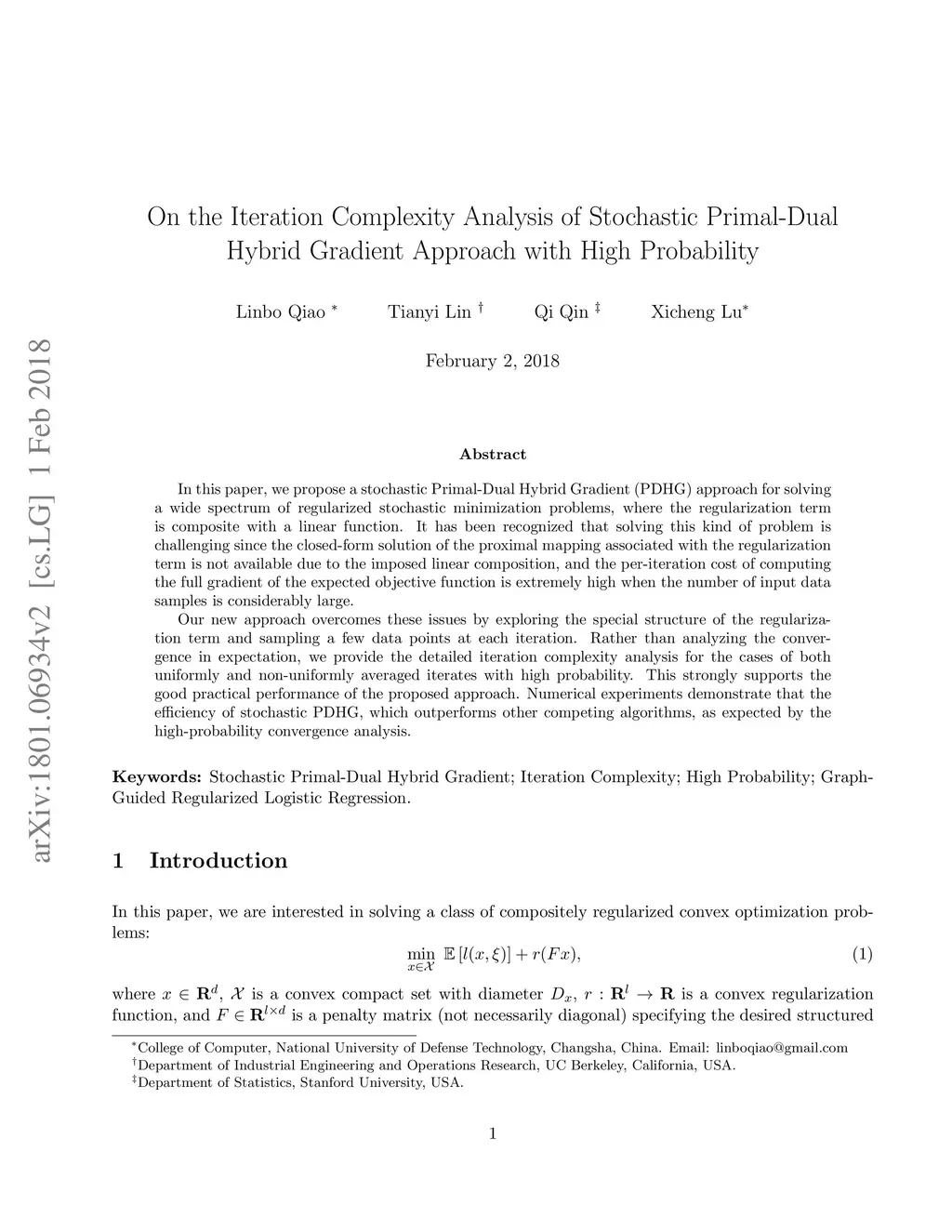 In this paper, we propose a stochastic Primal-Dual Hybrid Gradient (PDHG) approach for solving a wide spectrum of regularized stochastic minimization problems, where the regularization term is composite with a linear function. It has been recognized that solving this kind of problem is challenging since the closed-form solution of the proximal mapping associated with the regularization term is not available due to the imposed linear composition, and the per-iteration cost of computing the full gradient of the expected objective function is extremely high when the number of input data samples is considerably large. Our new approach overcomes these issues by exploring the special structure of the regularization term and sampling a few data points at each iteration. Rather than analyzing the convergence in expectation, we provide the detailed iteration complexity analysis for the cases of both uniformly and non-uniformly averaged iterates with high probability. This strongly supports the good practical performance of the proposed approach. Numerical experiments demonstrate that the efficiency of stochastic PDHG, which outperforms other competing algorithms, as expected by the high-probability convergence analysis.