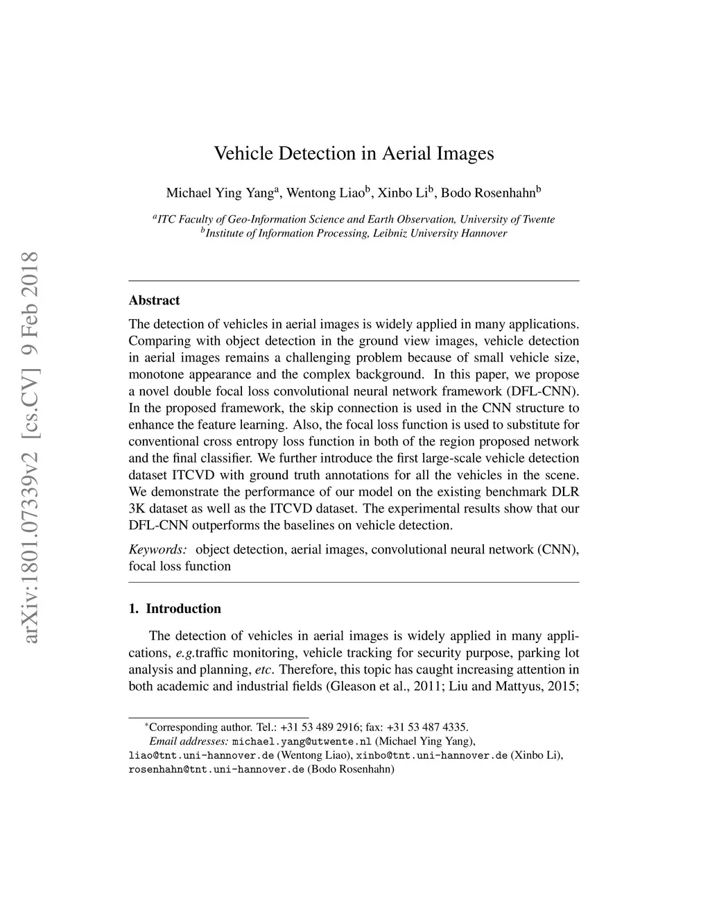 The detection of vehicles in aerial images is widely applied in many applications. Comparing with object detection in the ground view images, vehicle detection in aerial images remains a challenging problem because of small vehicle size, monotone appearance and the complex background. In this paper, we propose a novel double focal loss convolutional neural network framework (DFL-CNN). In the proposed framework, the skip connection is used in the CNN structure to enhance the feature learning. Also, the focal loss function is used to substitute for conventional cross entropy loss function in both of the region proposed network and the final classifier. We further introduce the first large-scale vehicle detection dataset ITCVD with ground truth annotations for all the vehicles in the scene. We demonstrate the performance of our model on the existing benchmark DLR 3K dataset as well as the ITCVD dataset. The experimental results show that our DFL-CNN outperforms the baselines on vehicle detection.