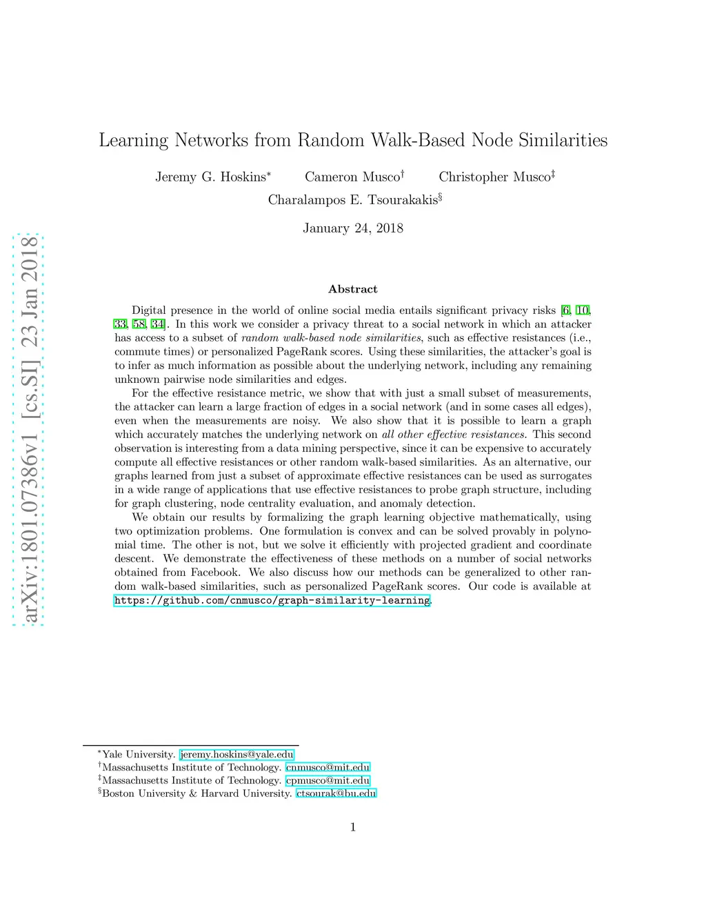 Digital presence in the world of online social media entails significant privacy risks. In this work we consider a privacy threat to a social network in which an attacker has access to a subset of random walk-based node similarities, such as effective resistances (i.e., commute times) or personalized PageRank scores. Using these similarities, the attacker's goal is to infer as much information as possible about the underlying network, including any remaining unknown pairwise node similarities and edges. For the effective resistance metric, we show that with just a small subset of measurements, the attacker can learn a large fraction of edges in a social network, even when the measurements are noisy. We also show that it is possible to learn a graph which accurately matches the underlying network on all other effective resistances. This second observation is interesting from a data mining perspective, since it can be expensive to accurately compute all effective resistances. As an alternative, our graphs learned from just a subset of approximate effective resistances can be used as surrogates in a wide range of applications that use effective resistances to probe graph structure, including for graph clustering, node centrality evaluation, and anomaly detection. We obtain our results by formalizing the graph learning objective mathematically, using two optimization problems. One formulation is convex and can be solved provably in polynomial time. The other is not, but we solve it efficiently with projected gradient and coordinate descent. We demonstrate the effectiveness of these methods on a number of social networks obtained from Facebook. We also discuss how our methods can be generalized to other random walk-based similarities, such as personalized PageRank. Our code is available at https://github.com/cnmusco/graph-similarity-learning.