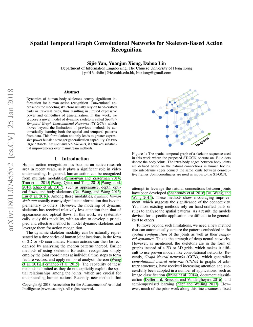 Dynamics of human body skeletons convey significant information for human action recognition. Conventional approaches for modeling skeletons usually rely on hand-crafted parts or traversal rules, thus resulting in limited expressive power and difficulties of generalization. In this work, we propose a novel model of dynamic skeletons called Spatial-Temporal Graph Convolutional Networks (ST-GCN), which moves beyond the limitations of previous methods by automatically learning both the spatial and temporal patterns from data. This formulation not only leads to greater expressive power but also stronger generalization capability. On two large datasets, Kinetics and NTU-RGBD, it achieves substantial improvements over mainstream methods.