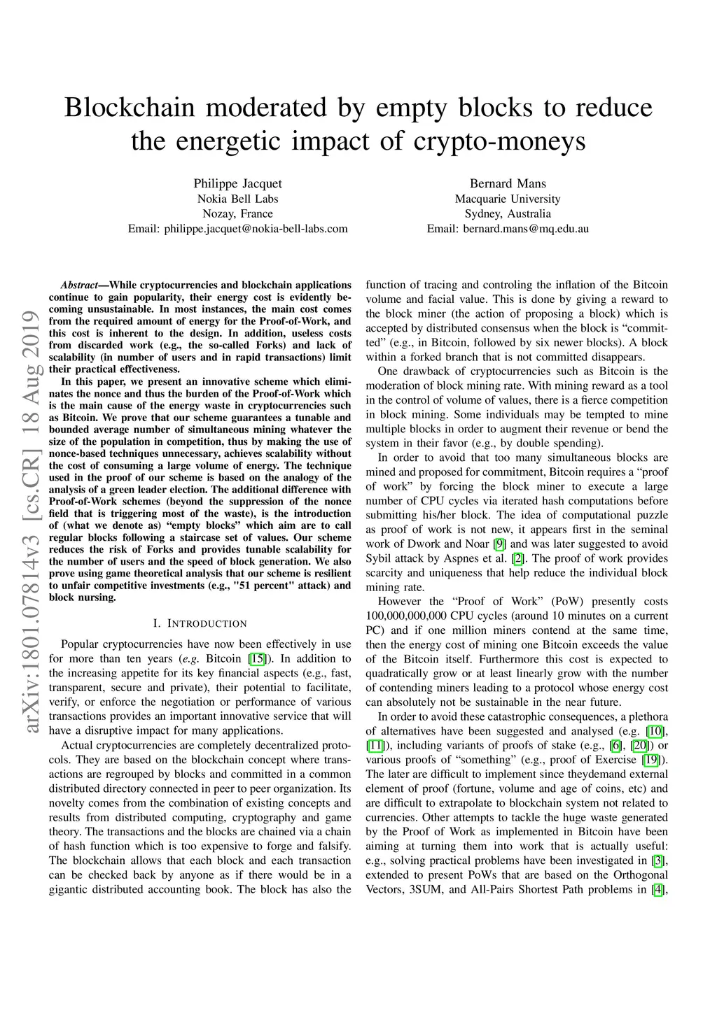 While cryptocurrencies and blockchain applications continue to gain popularity, their energy cost is evidently becoming unsustainable. In most instances, the main cost comes from the required amount of energy for the Proof-of-Work, and this cost is inherent to the design. In addition, useless costs from discarded work (e.g., the so-called Forks) and lack of scalability (in number of users and in rapid transactions) limit their practical effectiveness. In this paper, we present an innovative scheme which eliminates the nonce and thus the burden of the Proof-of-Work which is the main cause of the energy waste in cryptocurrencies such as Bitcoin. We prove that our scheme guarantees a tunable and bounded average number of simultaneous mining whatever the size of the population in competition, thus by making the use of nonce-based techniques unnecessary, achieves scalability without the cost of consuming a large volume of energy. The technique used in the proof of our scheme is based on the analogy of the analysis of a green leader election. The additional difference with Proof-of-Work schemes (beyond the suppression of the nonce field that is triggering most of the waste), is the introduction of (what we denote as) "empty blocks" which aim are to call regular blocks following a staircase set of values. Our scheme reduces the risk of Forks and provides tunable scalability for the number of users and the speed of block generation. We also prove using game theoretical analysis that our scheme is resilient to unfair competitive investments and block nursing.
