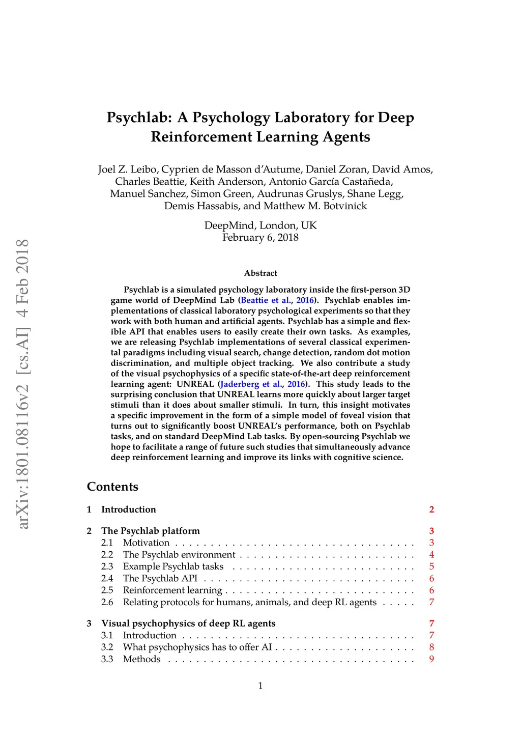 Psychlab is a simulated psychology laboratory inside the first-person 3D game world of DeepMind Lab (Beattie et al. 2016). Psychlab enables implementations of classical laboratory psychological experiments so that they work with both human and artificial agents. Psychlab has a simple and flexible API that enables users to easily create their own tasks. As examples, we are releasing Psychlab implementations of several classical experimental paradigms including visual search, change detection, random dot motion discrimination, and multiple object tracking. We also contribute a study of the visual psychophysics of a specific state-of-the-art deep reinforcement learning agent: UNREAL (Jaderberg et al. 2016). This study leads to the surprising conclusion that UNREAL learns more quickly about larger target stimuli than it does about smaller stimuli. In turn, this insight motivates a specific improvement in the form of a simple model of foveal vision that turns out to significantly boost UNREAL's performance, both on Psychlab tasks, and on standard DeepMind Lab tasks. By open-sourcing Psychlab we hope to facilitate a range of future such studies that simultaneously advance deep reinforcement learning and improve its links with cognitive science.