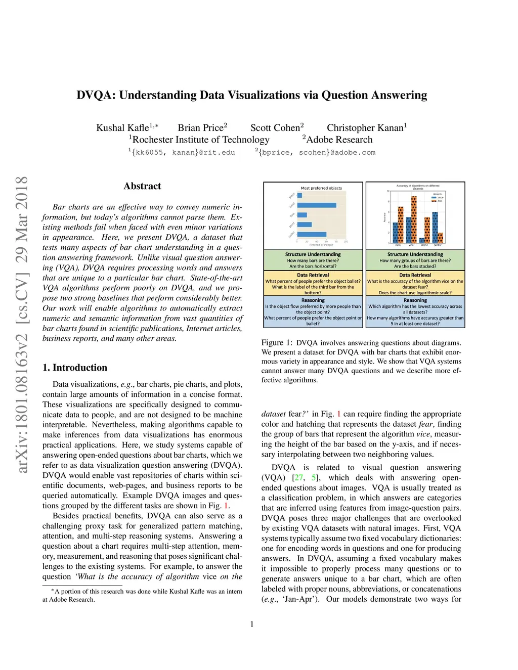 Bar charts are an effective way to convey numeric information, but today's algorithms cannot parse them. Existing methods fail when faced with even minor variations in appearance. Here, we present DVQA, a dataset that tests many aspects of bar chart understanding in a question answering framework. Unlike visual question answering (VQA), DVQA requires processing words and answers that are unique to a particular bar chart. State-of-the-art VQA algorithms perform poorly on DVQA, and we propose two strong baselines that perform considerably better. Our work will enable algorithms to automatically extract numeric and semantic information from vast quantities of bar charts found in scientific publications, Internet articles, business reports, and many other areas.