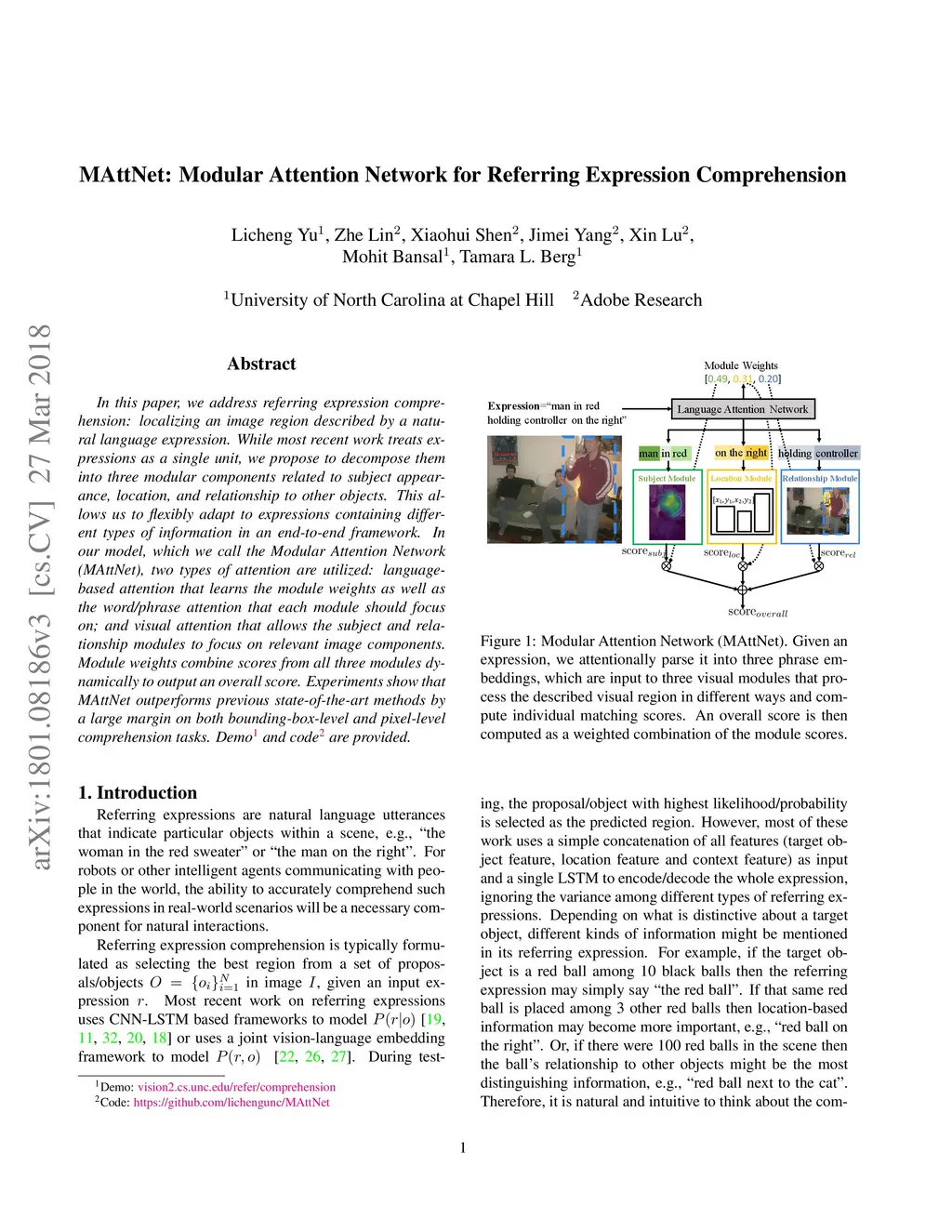 In this paper, we address referring expression comprehension: localizing an image region described by a natural language expression. While most recent work treats expressions as a single unit, we propose to decompose them into three modular components related to subject appearance, location, and relationship to other objects. This allows us to flexibly adapt to expressions containing different types of information in an end-to-end framework. In our model, which we call the Modular Attention Network (MAttNet), two types of attention are utilized: language-based attention that learns the module weights as well as the word/phrase attention that each module should focus on; and visual attention that allows the subject and relationship modules to focus on relevant image components. Module weights combine scores from all three modules dynamically to output an overall score. Experiments show that MAttNet outperforms previous state-of-art methods by a large margin on both bounding-box-level and pixel-level comprehension tasks. Demo and code are provided.