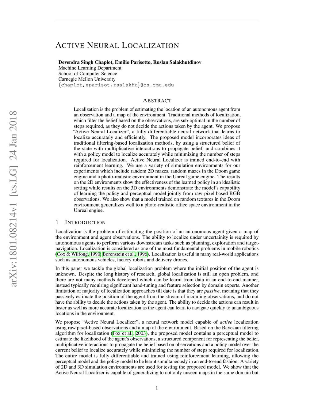 Localization is the problem of estimating the location of an autonomous agent from an observation and a map of the environment. Traditional methods of localization, which filter the belief based on the observations, are sub-optimal in the number of steps required, as they do not decide the actions taken by the agent. We propose "Active Neural Localizer", a fully differentiable neural network that learns to localize accurately and efficiently. The proposed model incorporates ideas of traditional filtering-based localization methods, by using a structured belief of the state with multiplicative interactions to propagate belief, and combines it with a policy model to localize accurately while minimizing the number of steps required for localization. Active Neural Localizer is trained end-to-end with reinforcement learning. We use a variety of simulation environments for our experiments which include random 2D mazes, random mazes in the Doom game engine and a photo-realistic environment in the Unreal game engine. The results on the 2D environments show the effectiveness of the learned policy in an idealistic setting while results on the 3D environments demonstrate the model's capability of learning the policy and perceptual model jointly from raw-pixel based RGB observations. We also show that a model trained on random textures in the Doom environment generalizes well to a photo-realistic office space environment in the Unreal engine.