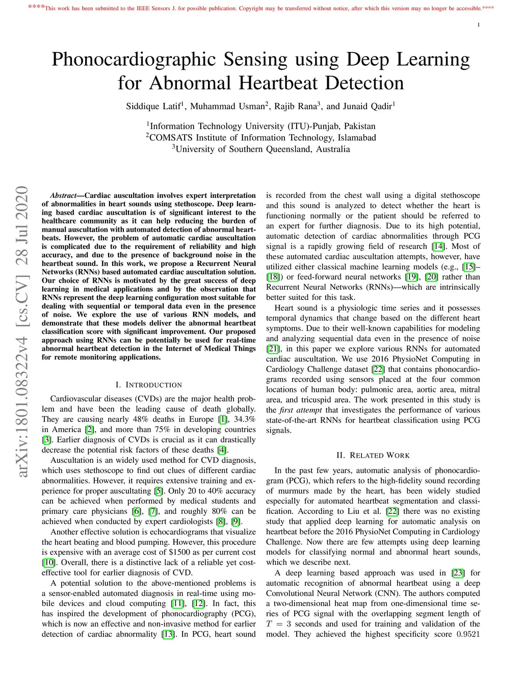 Phonocardiographic Sensing using Deep Learning for Abnormal Heartbeat