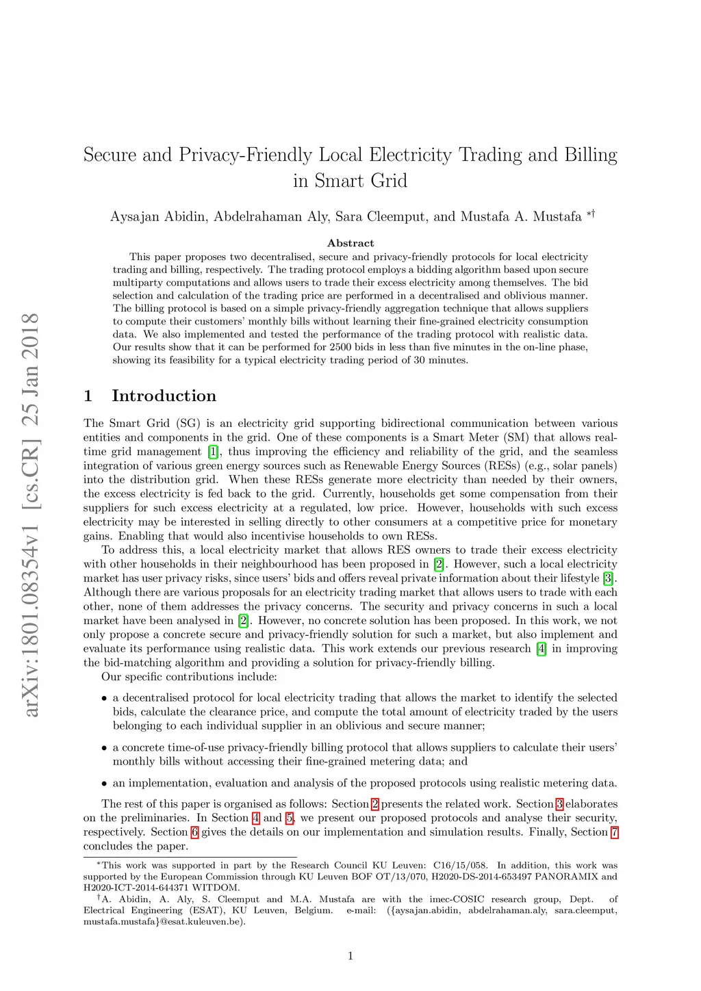 This paper proposes two decentralised, secure and privacy-friendly protocols for local electricity trading and billing, respectively. The trading protocol employs a bidding algorithm based upon secure multiparty computations and allows users to trade their excess electricity among themselves. The bid selection and calculation of the trading price are performed in a decentralised and oblivious manner. The billing protocol is based on a simple privacy-friendly aggregation technique that allows suppliers to compute their customers' monthly bills without learning their fine-grained electricity consumption data. We also implemented and tested the performance of the trading protocol with realistic data. Our results show that it can be performed for 2500 bids in less than five minutes in the on-line phase, showing its feasibility for a typical electricity trading period of 30 minutes.