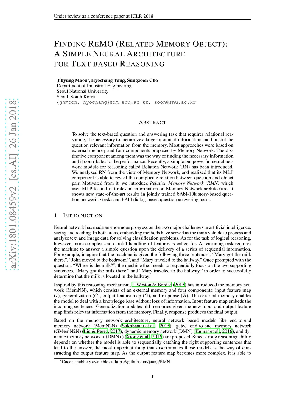 To solve the text-based question and answering task that requires relational reasoning, it is necessary to memorize a large amount of information and find out the question relevant information from the memory. Most approaches were based on external memory and four components proposed by Memory Network. The distinctive component among them was the way of finding the necessary information and it contributes to the performance. Recently, a simple but powerful neural network module for reasoning called Relation Network (RN) has been introduced. We analyzed RN from the view of Memory Network, and realized that its MLP component is able to reveal the complicate relation between question and object pair. Motivated from it, we introduce which uses MLP to find out relevant information on Memory Network architecture. It shows new state-of-the-art results in jointly trained bAbI-10k story-based question answering tasks and bAbI dialog-based question answering tasks.