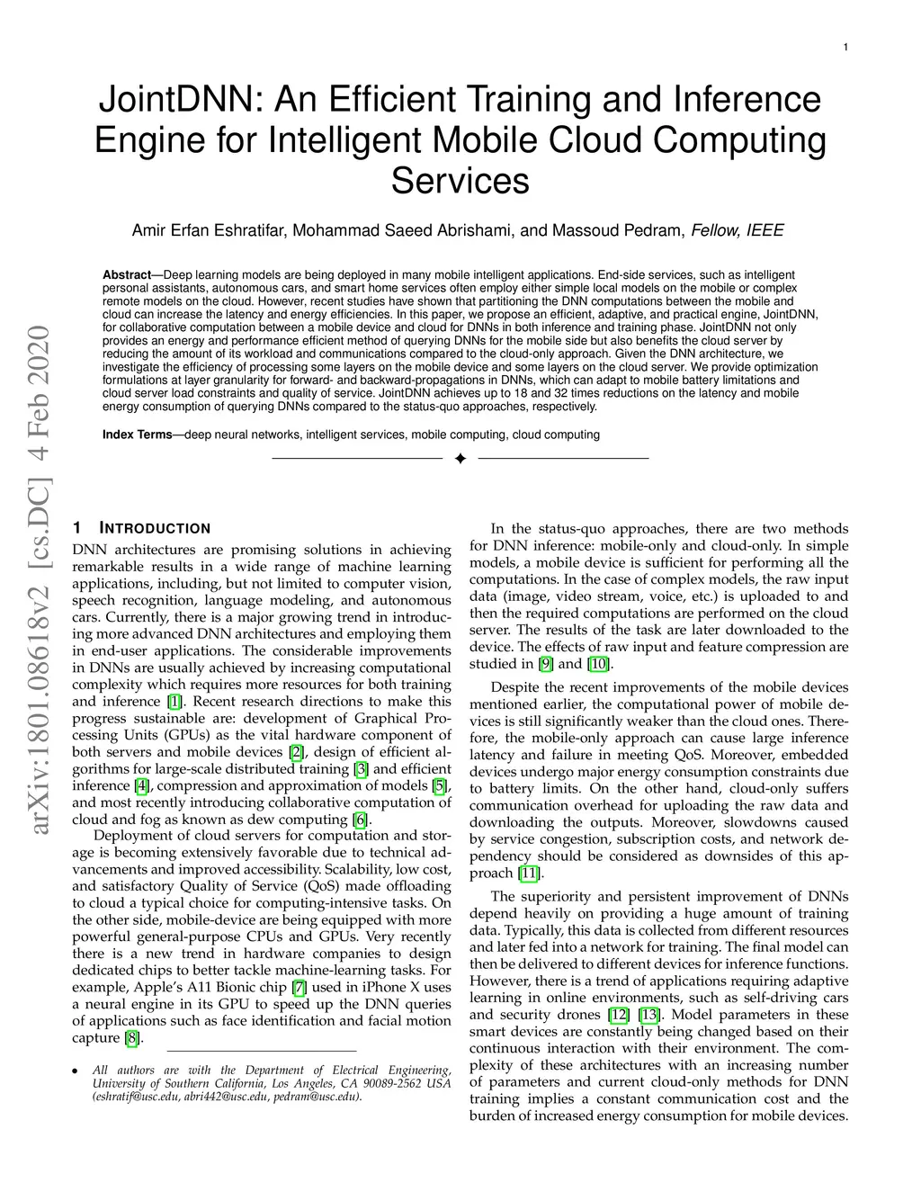 Deep learning models are being deployed in many mobile intelligent applications. End-side services, such as intelligent personal assistants, autonomous cars, and smart home services often employ either simple local models on the mobile or complex remote models on the cloud. However, recent studies have shown that partitioning the DNN computations between the mobile and cloud can increase the latency and energy efficiencies. In this paper, we propose an efficient, adaptive, and practical engine, JointDNN, for collaborative computation between a mobile device and cloud for DNNs in both inference and training phase. JointDNN not only provides an energy and performance efficient method of querying DNNs for the mobile side but also benefits the cloud server by reducing the amount of its workload and communications compared to the cloud-only approach. Given the DNN architecture, we investigate the efficiency of processing some layers on the mobile device and some layers on the cloud server. We provide optimization formulations at layer granularity for forward- and backward-propagations in DNNs, which can adapt to mobile battery limitations and cloud server load constraints and quality of service. JointDNN achieves up to 18 and 32 times reductions on the latency and mobile energy consumption of querying DNNs compared to the status-quo approaches, respectively.