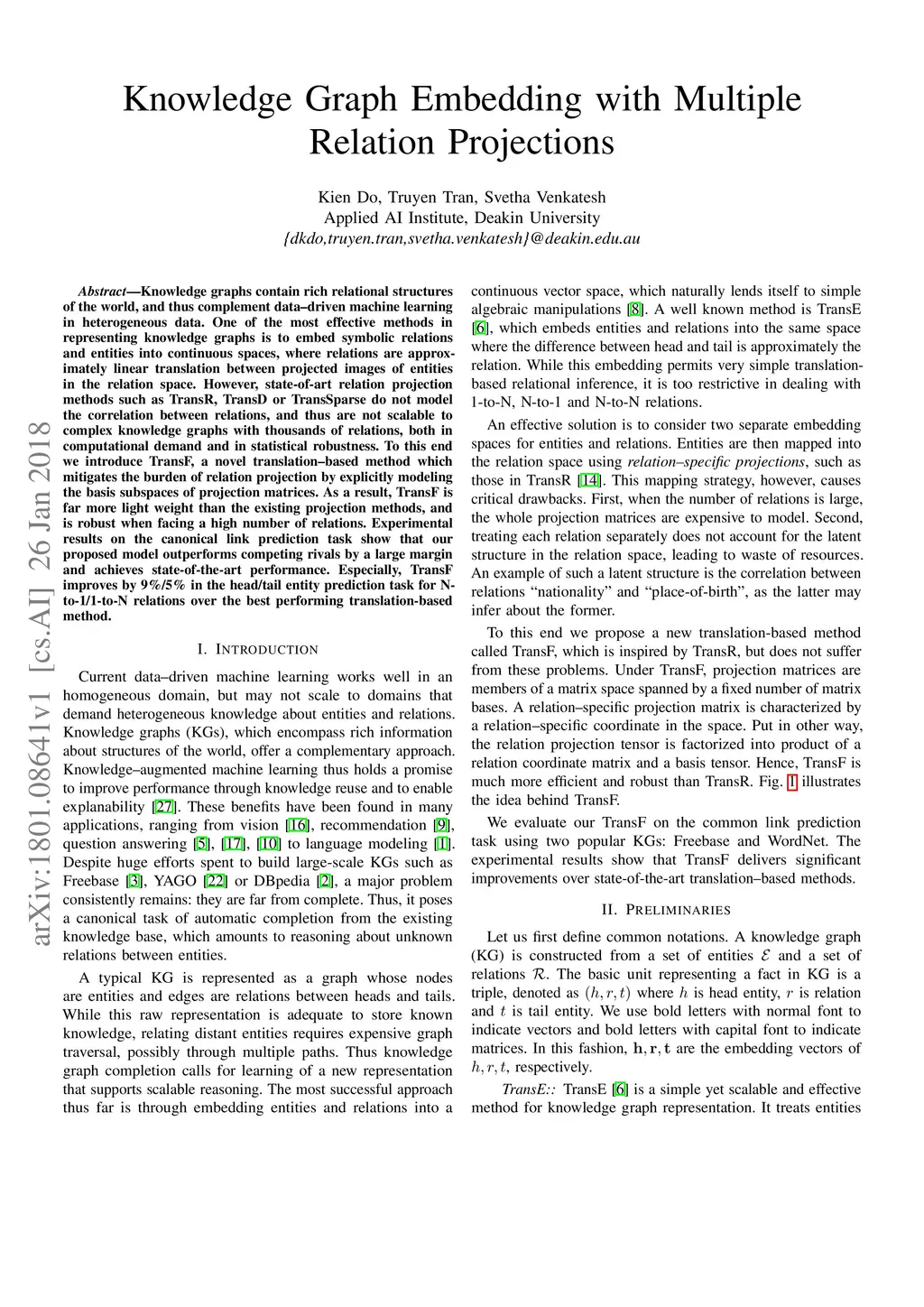 Knowledge graphs contain rich relational structures of the world, and thus complement data-driven machine learning in heterogeneous data. One of the most effective methods in representing knowledge graphs is to embed symbolic relations and entities into continuous spaces, where relations are approximately linear translation between projected images of entities in the relation space. However, state-of-the-art relation projection methods such as TransR, TransD or TransSparse do not model the correlation between relations, and thus are not scalable to complex knowledge graphs with thousands of relations, both in computational demand and in statistical robustness. To this end we introduce TransF, a novel translation-based method which mitigates the burden of relation projection by explicitly modeling the basis subspaces of projection matrices. As a result, TransF is far more light weight than the existing projection methods, and is robust when facing a high number of relations. Experimental results on the canonical link prediction task show that our proposed model outperforms competing rivals by a large margin and achieves state-of-the-art performance. Especially, TransF improves by 9%/5% in the head/tail entity prediction task for N-to-1/1-to-N relations over the best performing translation-based method.