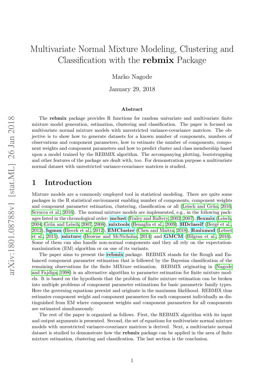 The rebmix package provides R functions for random univariate and multivariate finite mixture model generation, estimation, clustering and classification. The paper is focused on multivariate normal mixture models with unrestricted variance-covariance matrices. The objective is to show how to generate datasets for a known number of components, numbers of observations and component parameters, how to estimate the number of components, component weights and component parameters and how to predict cluster and class membership based upon a model trained by the REBMIX algorithm. The accompanying plotting, bootstrapping and other features of the package are dealt with, too. For demonstration purpose a multivariate normal dataset with unrestricted variance-covariance matrices is studied.