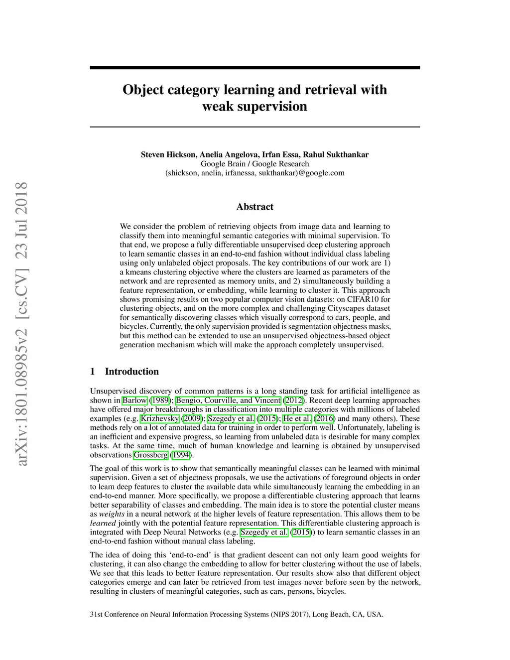 We consider the problem of retrieving objects from image data and learning to classify them into meaningful semantic categories with minimal supervision. To that end, we propose a fully differentiable unsupervised deep clustering approach to learn semantic classes in an end-to-end fashion without individual class labeling using only unlabeled object proposals. The key contributions of our work are 1) a kmeans clustering objective where the clusters are learned as parameters of the network and are represented as memory units, and 2) simultaneously building a feature representation, or embedding, while learning to cluster it. This approach shows promising results on two popular computer vision datasets: on CIFAR10 for clustering objects, and on the more complex and challenging Cityscapes dataset for semantically discovering classes which visually correspond to cars, people, and bicycles. Currently, the only supervision provided is segmentation objectness masks, but this method can be extended to use an unsupervised objectness-based object generation mechanism which will make the approach completely unsupervised.