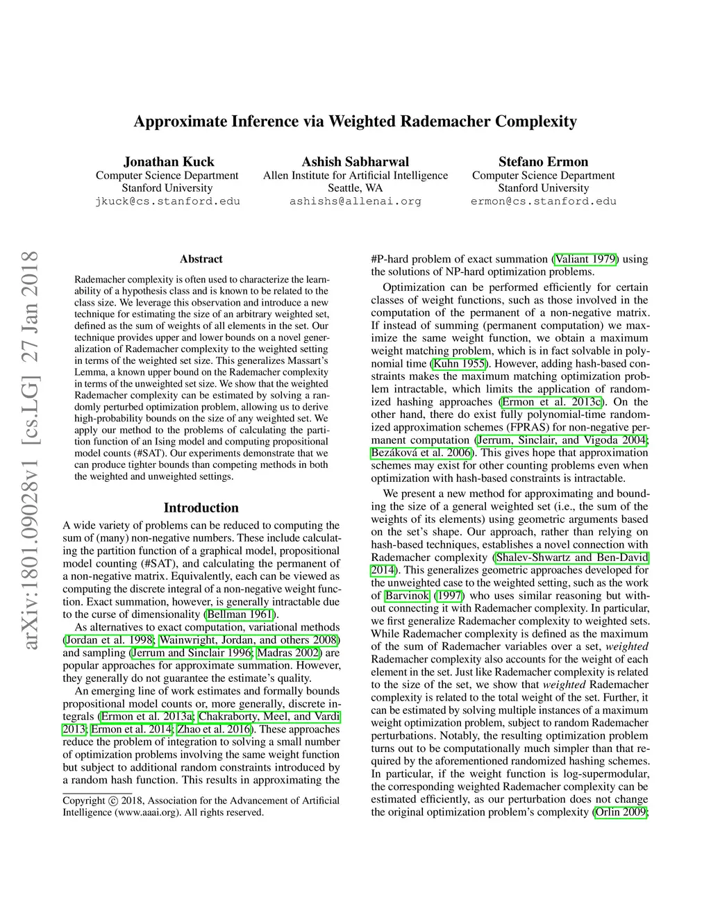 Rademacher complexity is often used to characterize the learnability of a hypothesis class and is known to be related to the class size. We leverage this observation and introduce a new technique for estimating the size of an arbitrary weighted set, defined as the sum of weights of all elements in the set. Our technique provides upper and lower bounds on a novel generalization of Rademacher complexity to the weighted setting in terms of the weighted set size. This generalizes Massart's Lemma, a known upper bound on the Rademacher complexity in terms of the unweighted set size. We show that the weighted Rademacher complexity can be estimated by solving a randomly perturbed optimization problem, allowing us to derive high-probability bounds on the size of any weighted set. We apply our method to the problems of calculating the partition function of an Ising model and computing propositional model counts (#SAT). Our experiments demonstrate that we can produce tighter bounds than competing methods in both the weighted and unweighted settings.