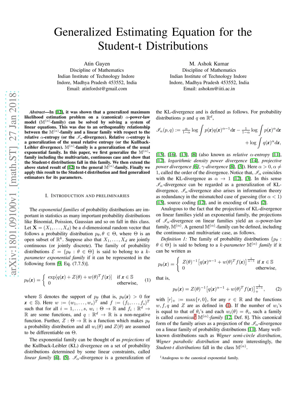 Generalized Estimating Equation for the Student-t Distributions