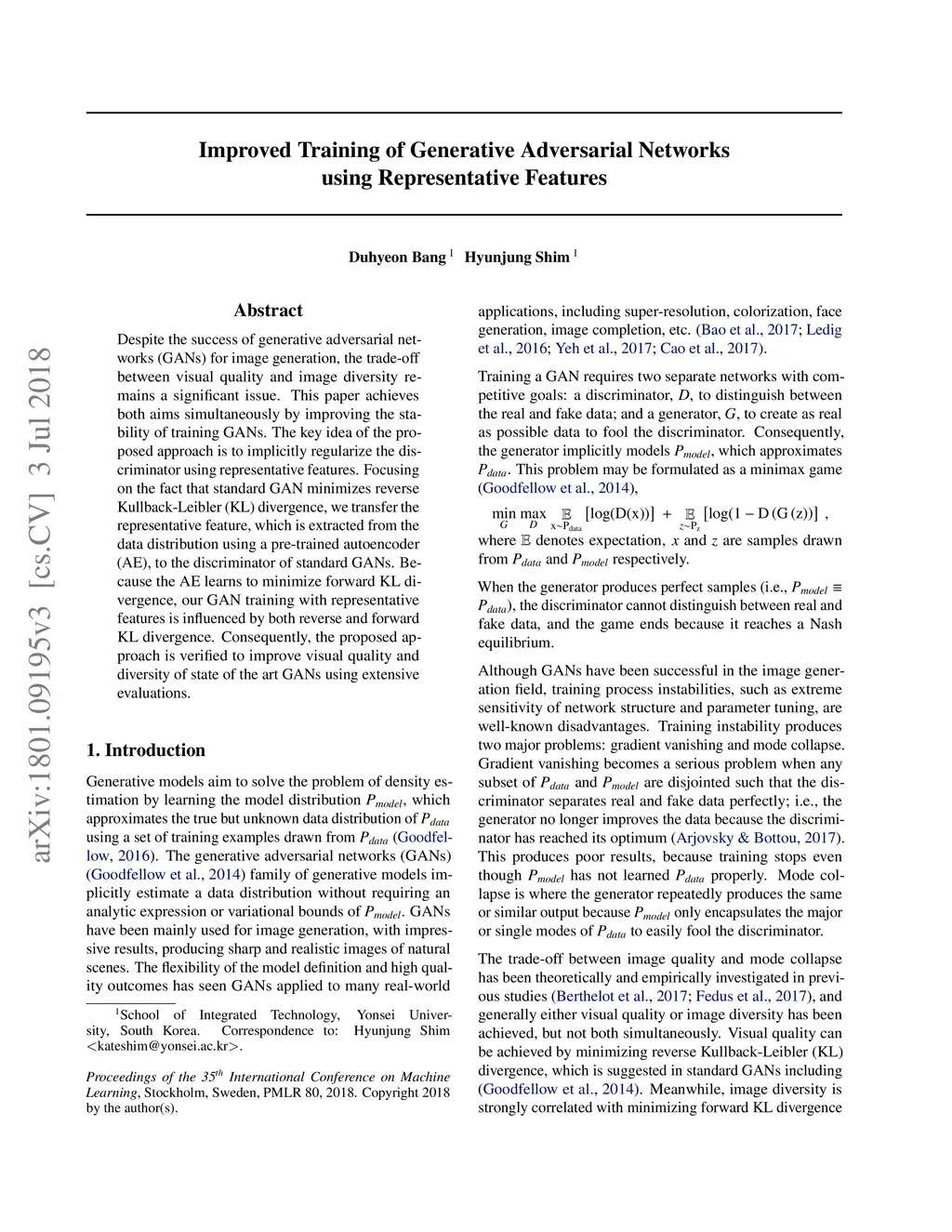 Despite the success of generative adversarial networks (GANs) for image generation, the trade-off between visual quality and image diversity remains a significant issue. This paper achieves both aims simultaneously by improving the stability of training GANs. The key idea of the proposed approach is to implicitly regularize the discriminator using representative features. Focusing on the fact that standard GAN minimizes reverse Kullback-Leibler (KL) divergence, we transfer the representative feature, which is extracted from the data distribution using a pre-trained autoencoder (AE), to the discriminator of standard GANs. Because the AE learns to minimize forward KL divergence, our GAN training with representative features is influenced by both reverse and forward KL divergence. Consequently, the proposed approach is verified to improve visual quality and diversity of state of the art GANs using extensive evaluations.