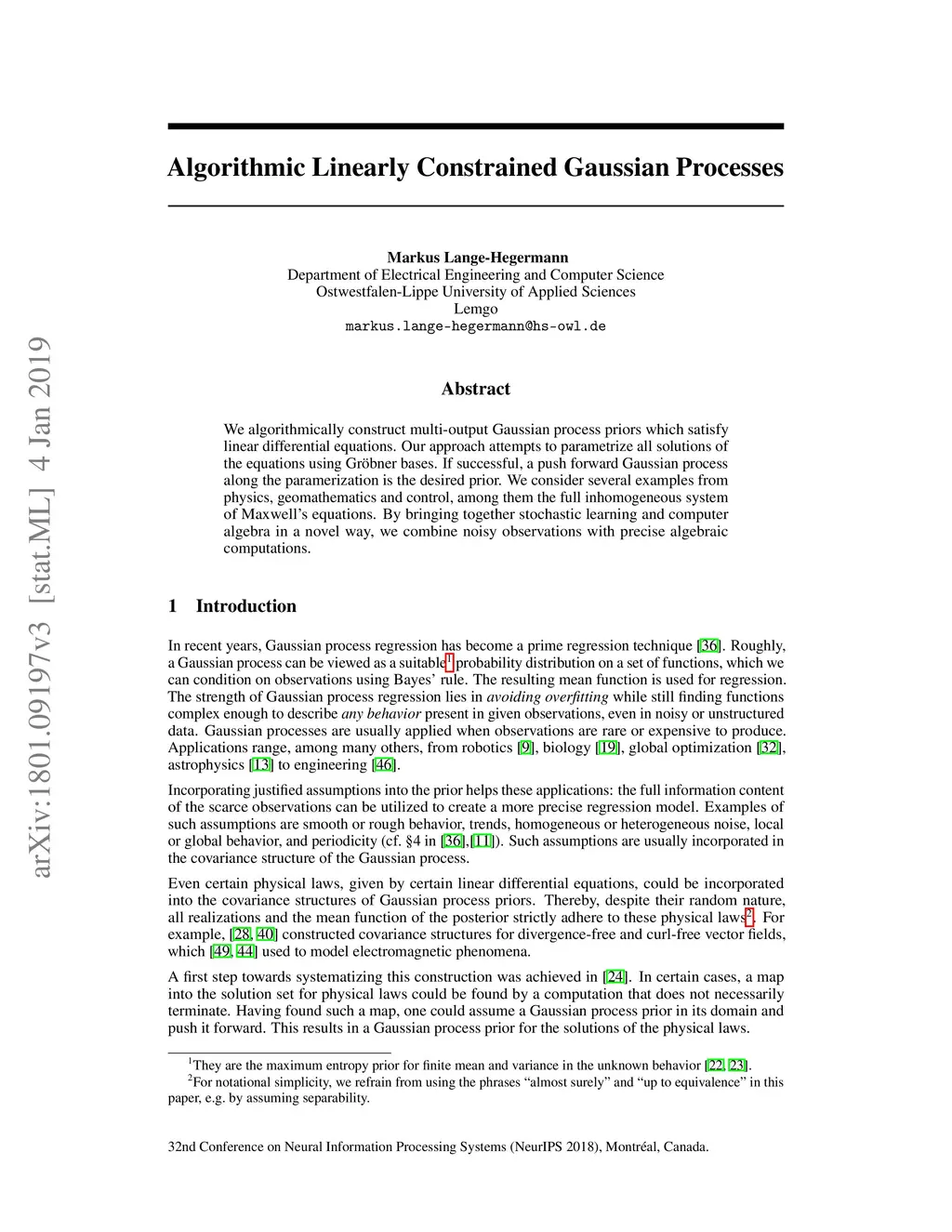 We algorithmically construct multi-output Gaussian process priors which satisfy linear differential equations. Our approach attempts to parametrize all solutions of the equations using Gr\"obner bases. If successful, a push forward Gaussian process along the paramerization is the desired prior. We consider several examples from physics, geomathematics and control, among them the full inhomogeneous system of Maxwell's equations. By bringing together stochastic learning and computer algebra in a novel way, we combine noisy observations with precise algebraic computations.