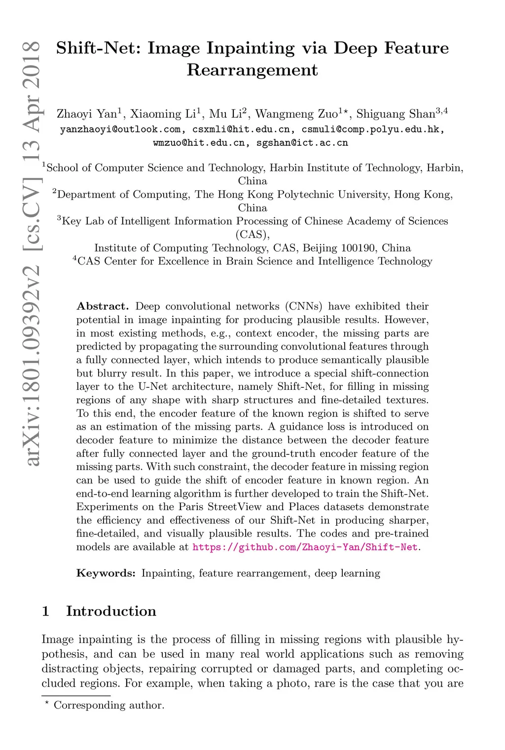 Shift-Net: Image Inpainting via Deep Feature Rearrangement