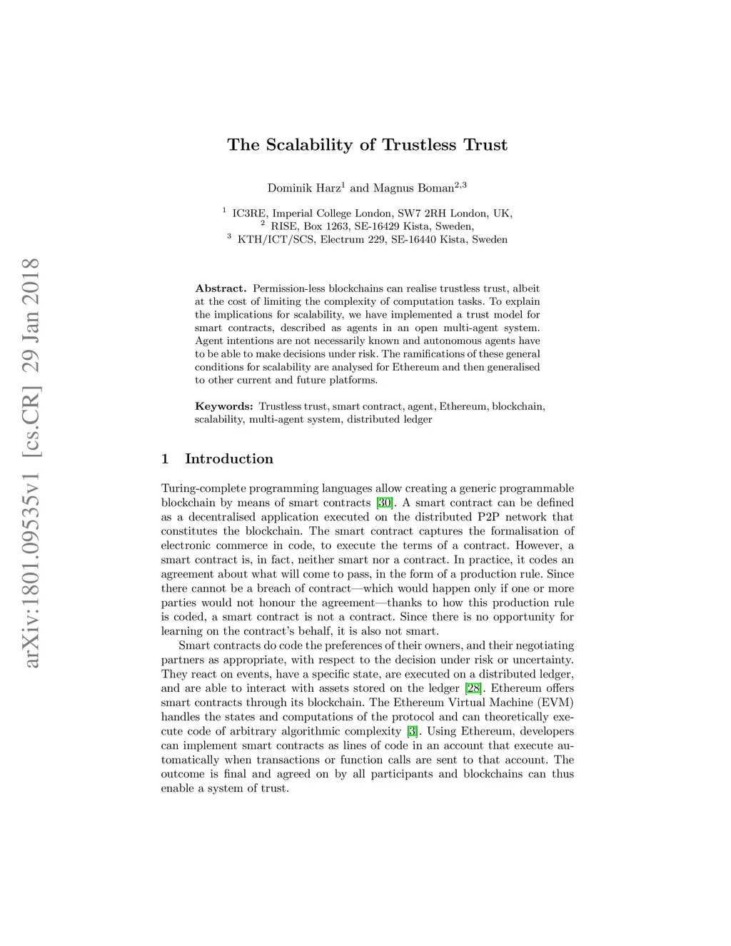 Permission-less blockchains can realise trustless trust, albeit at the cost of limiting the complexity of computation tasks. To explain the implications for scalability, we have implemented a trust model for smart contracts, described as agents in an open multi-agent system. Agent intentions are not necessarily known and autonomous agents have to be able to make decisions under risk. The ramifications of these general conditions for scalability are analysed for Ethereum and then generalised to other current and future platforms.