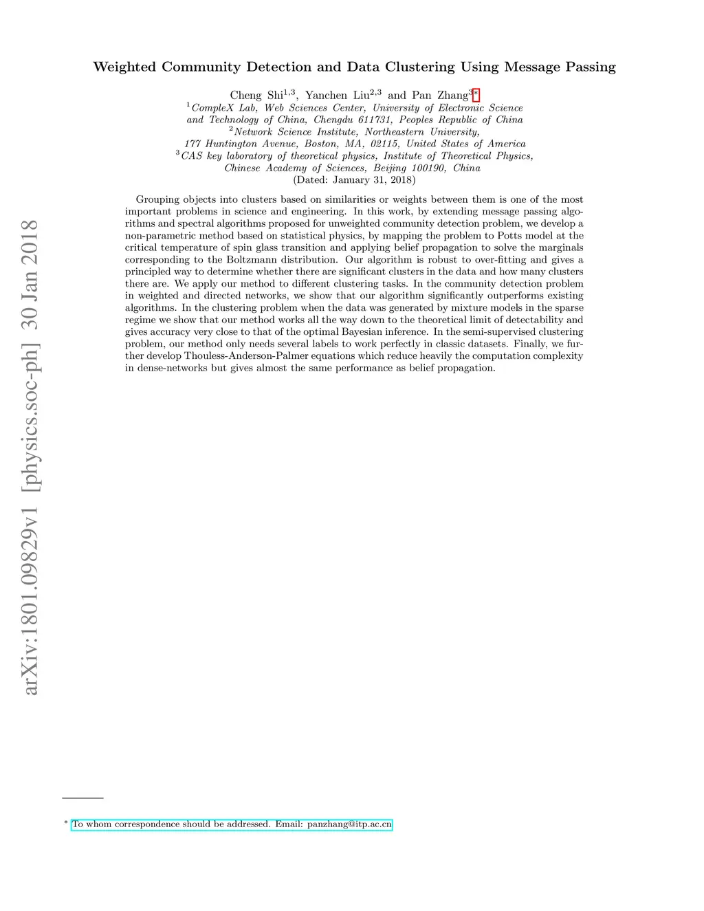 Grouping objects into clusters based on similarities or weights between them is one of the most important problems in science and engineering. In this work, by extending message passing algorithms and spectral algorithms proposed for unweighted community detection problem, we develop a non-parametric method based on statistical physics, by mapping the problem to Potts model at the critical temperature of spin glass transition and applying belief propagation to solve the marginals corresponding to the Boltzmann distribution. Our algorithm is robust to over-fitting and gives a principled way to determine whether there are significant clusters in the data and how many clusters there are. We apply our method to different clustering tasks and use extensive numerical experiments to illustrate the advantage of our method over existing algorithms. In the community detection problem in weighted and directed networks, we show that our algorithm significantly outperforms existing algorithms. In the clustering problem when the data was generated by mixture models in the sparse regime we show that our method works to the theoretical limit of detectability and gives accuracy very close to that of the optimal Bayesian inference. In the semi-supervised clustering problem, our method only needs several labels to work perfectly in classic datasets. Finally, we further develop Thouless-Anderson-Palmer equations which reduce heavily the computation complexity in dense-networks but gives almost the same performance as belief propagation.