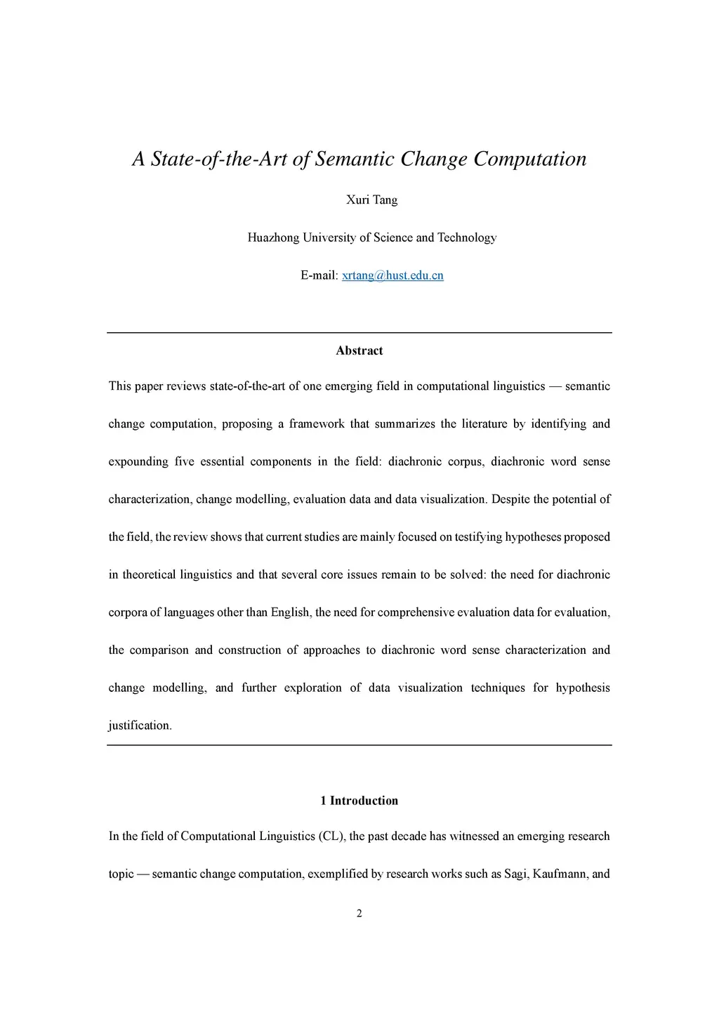 This paper reviews the state-of-the-art of semantic change computation, one emerging research field in computational linguistics, proposing a framework that summarizes the literature by identifying and expounding five essential components in the field: diachronic corpus, diachronic word sense characterization, change modelling, evaluation data and data visualization. Despite the potential of the field, the review shows that current studies are mainly focused on testifying hypotheses proposed in theoretical linguistics and that several core issues remain to be solved: the need for diachronic corpora of languages other than English, the need for comprehensive evaluation data for evaluation, the comparison and construction of approaches to diachronic word sense characterization and change modelling, and further exploration of data visualization techniques for hypothesis justification.