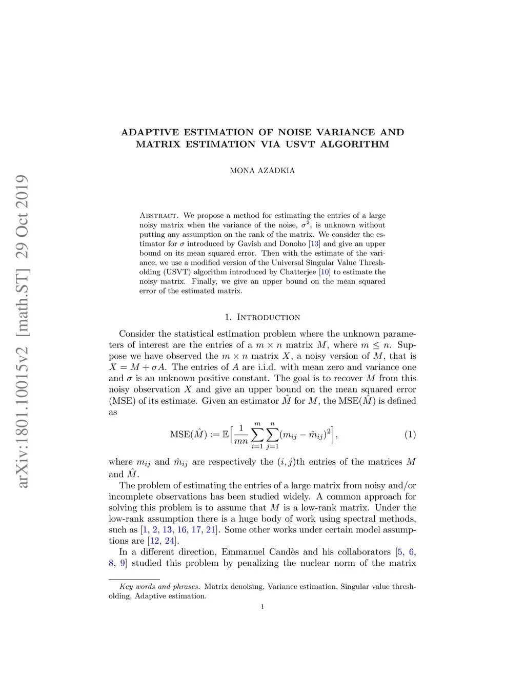 We propose a method for estimating the entries of a large noisy matrix when the variance of the noise, , is unknown without putting any assumption on the rank of the matrix. We consider the estimator for introduced by Gavish and Donoho \cite{Gavish} and give an upper bound on its mean squared error. Then with the estimate of the variance, we use a modified version of the Universal Singular Value Thresholding (USVT) algorithm introduced by Chatterjee \cite{Chatterjee} to estimate the noisy matrix. Finally, we give an upper bound on the mean squared error of the estimated matrix.