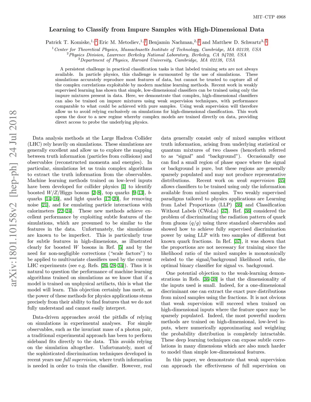 A persistent challenge in practical classification tasks is that labeled training sets are not always available. In particle physics, this challenge is surmounted by the use of simulations. These simulations accurately reproduce most features of data, but cannot be trusted to capture all of the complex correlations exploitable by modern machine learning methods. Recent work in weakly supervised learning has shown that simple, low-dimensional classifiers can be trained using only the impure mixtures present in data. Here, we demonstrate that complex, high-dimensional classifiers can also be trained on impure mixtures using weak supervision techniques, with performance comparable to what could be achieved with pure samples. Using weak supervision will therefore allow us to avoid relying exclusively on simulations for high-dimensional classification. This work opens the door to a new regime whereby complex models are trained directly on data, providing direct access to probe the underlying physics.
