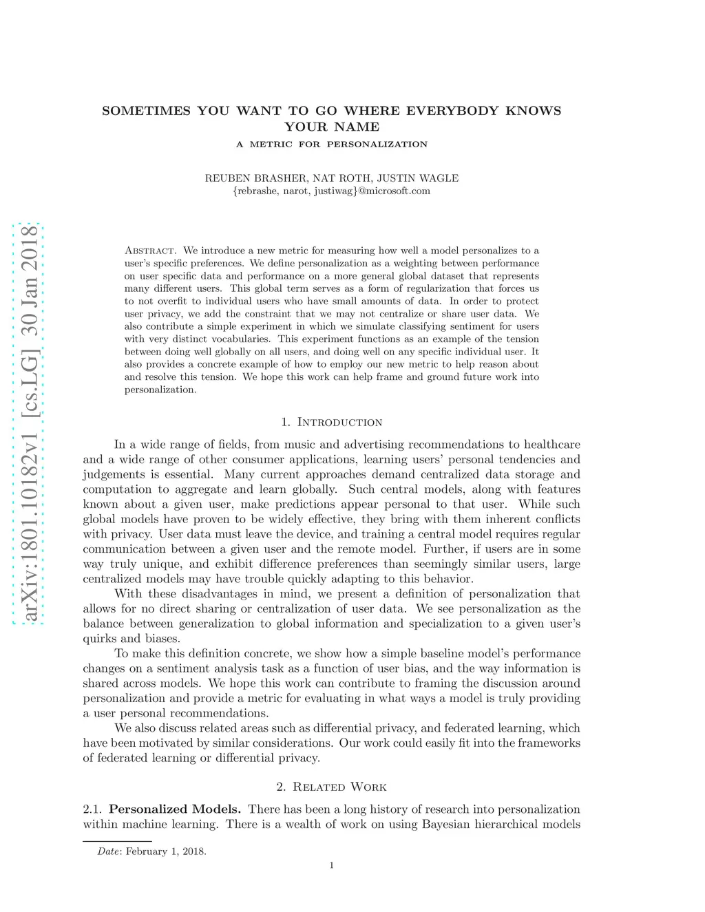 We introduce a new metric for measuring how well a model personalizes to a user's specific preferences. We define personalization as a weighting between performance on user specific data and performance on a more general global dataset that represents many different users. This global term serves as a form of regularization that forces us to not overfit to individual users who have small amounts of data. In order to protect user privacy, we add the constraint that we may not centralize or share user data. We also contribute a simple experiment in which we simulate classifying sentiment for users with very distinct vocabularies. This experiment functions as an example of the tension between doing well globally on all users, and doing well on any specific individual user. It also provides a concrete example of how to employ our new metric to help reason about and resolve this tension. We hope this work can help frame and ground future work into personalization.